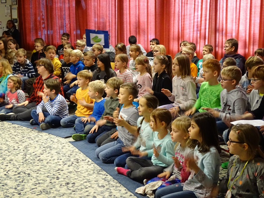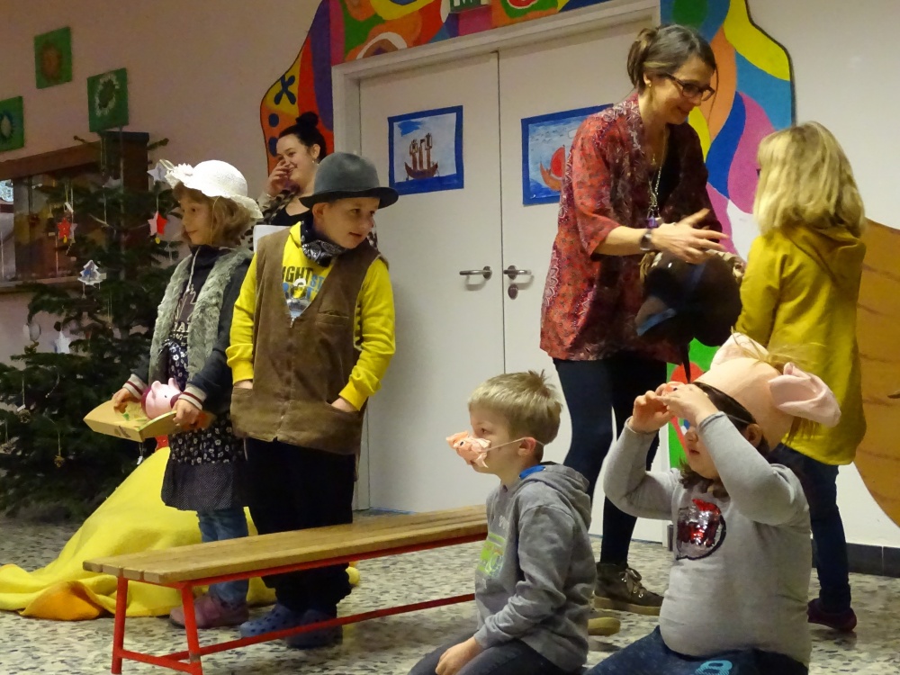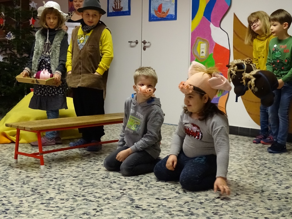 In dieser Woche überraschten uns die jüngeren Kinder der Helga-Leinung-Schule mit ihrem Stück von zwei kleinen Schweinen eines großen Bauernhofes mit den Bauersleuten und Pferden im Stall. Die Schweine sollten zum Fest geschlachtet und verspeist werden. Nein!!! Das wollten die beiden Schweine auf gar keinen Fall!