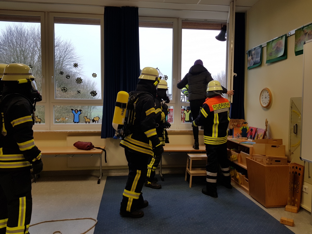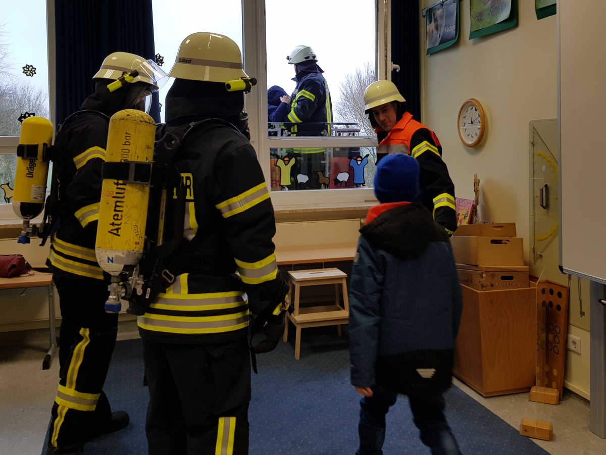 Es dauerte nicht lange, da erschienen in den Räumen Feuerwehrleute nicht nur in Schutzkleidung, sondern auch mit Atemschutzgerät, also Atemluftflasche auf dem Rücken und Maske auf dem Gesicht. Das fühlte sich für so manch ein Kind besonders aus den 1. Klassen sehr fremd und ein bisschen angsteinflößend an, zumal die Atemgeräusche wie aus einem science-fiction-Film klangen. Schnell aber konnten die Klassenlehrerinnen und auch die Feuerwehrmänner selbst die Kinder beruhigen und sie zügig auf die ''Rettung'' vorbereiten.