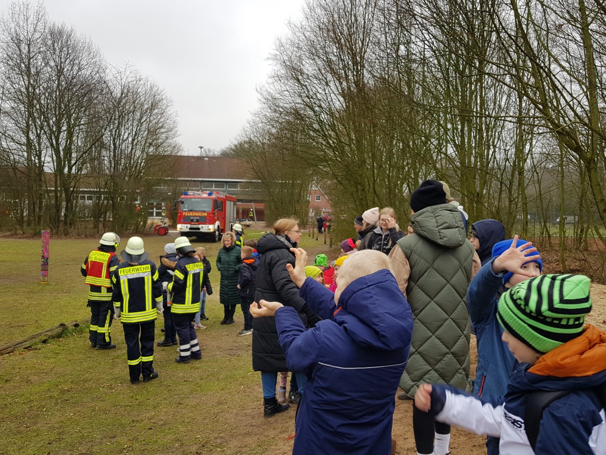 Und schon bald tauchten die ersten von vielen Feuerwehrwagen und Feuerwehrfrauen und -männer in voller Montur und Ausrüstung auf! Einige Kinder zeigten sofort auf ihre Väter, die dazugehörten. Viele Feuerwehrleute stammen aus den Wehren der benachbarten Orte. Alle waren sie genau im Kontakt miteinander - aber auch mit den Klassen! Diese wurden über die Situation informiert und gefragt, ob es ihnen gut ginge.