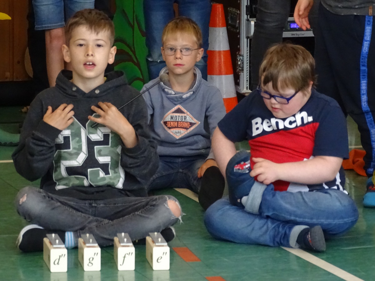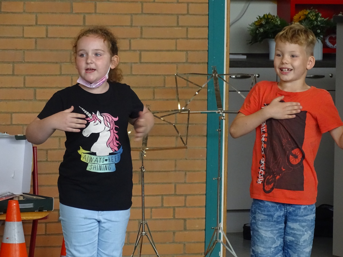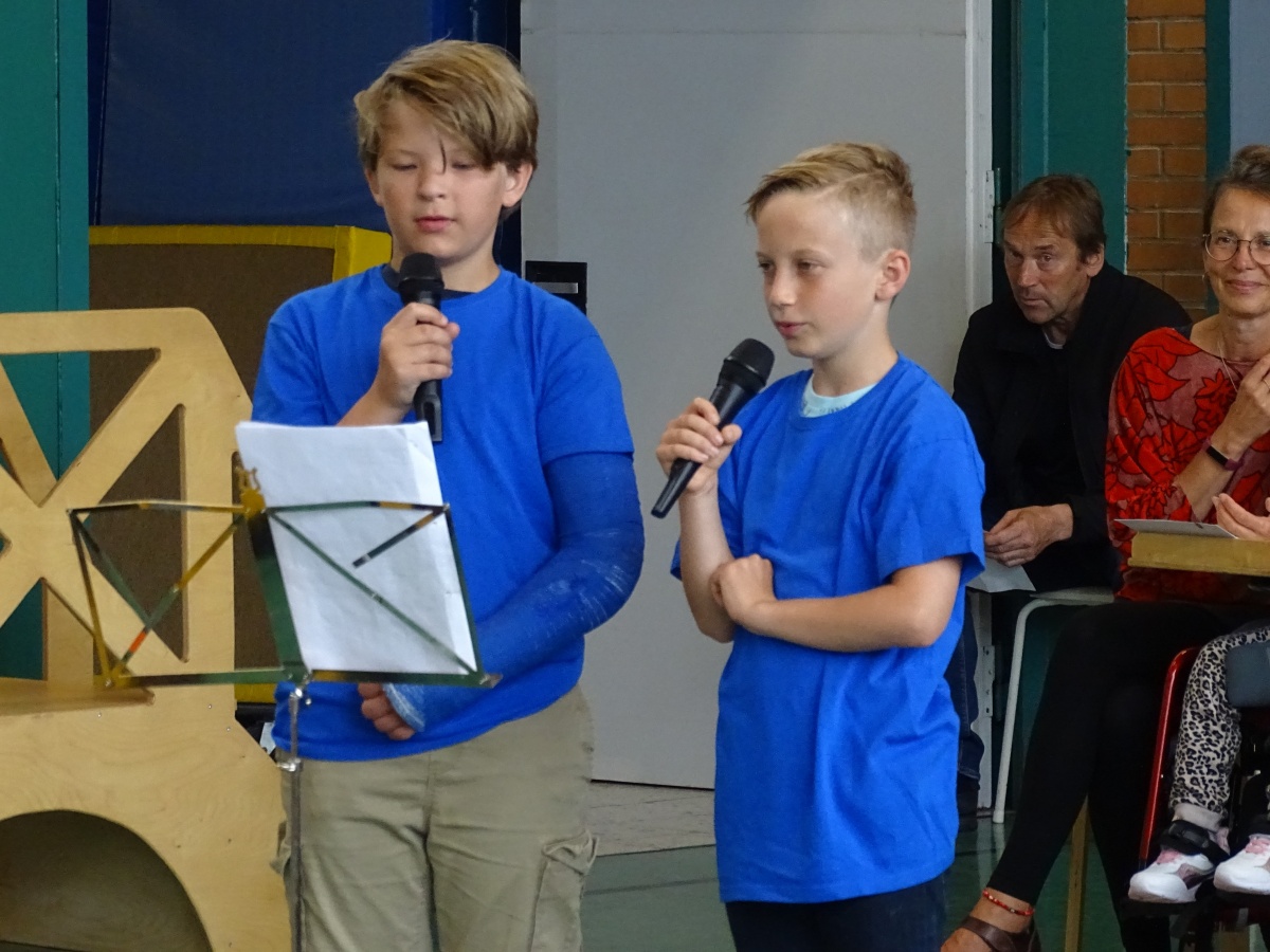Um einmal ganz alleine auf der Bühne zu stehen, bedarf es eines schönes Liedes und großen Mutes! Beides brachten Klaas und sein jüngerer Bruder Jarno tatsächlich auf. Sie sangen uns das Lied ''Es ist Zeit um zu gehen''.