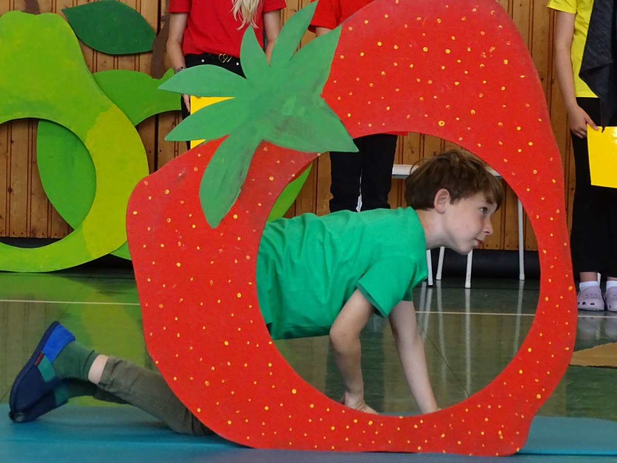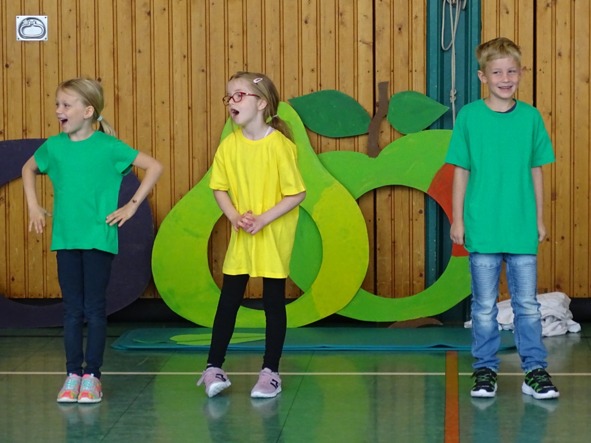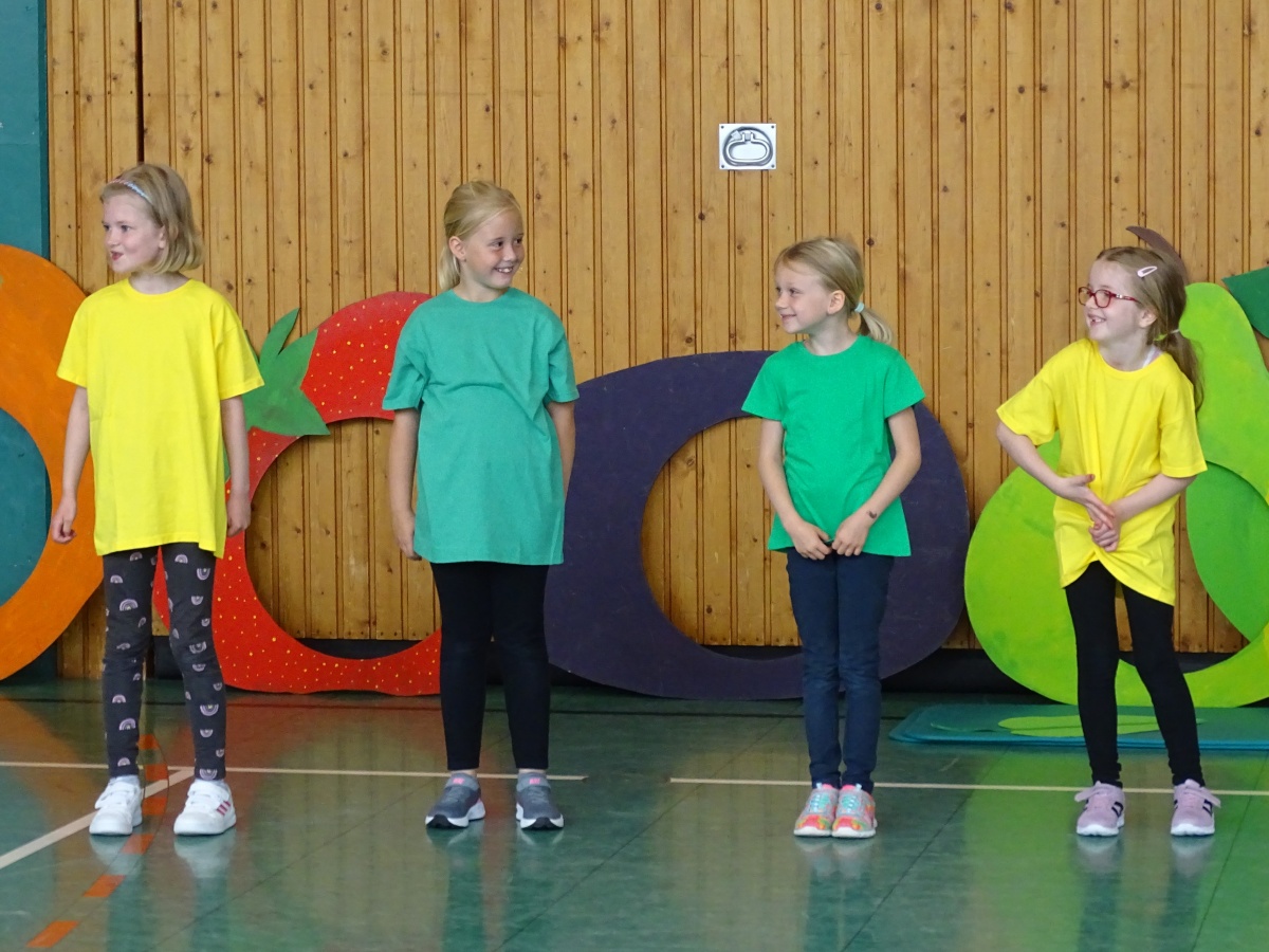 In einer Gemeinschaftsaktion führten uns jetzt die Hauptpersonen des heutigen Tages - alle Viertklässlerinnen und Viertklässler - das kleine Theaterstück ''Caterpillar'' vor, ein Stück, dass uns auf englisch darbot, wie sich eine Raupe durch viele viele Früchte und durch Köstlichkeiten wie Kuchen, Eis, Würstchen und Bonbons frisst, um sich schließlich zu einem wunderschönen Schmetterling zu entwickeln.