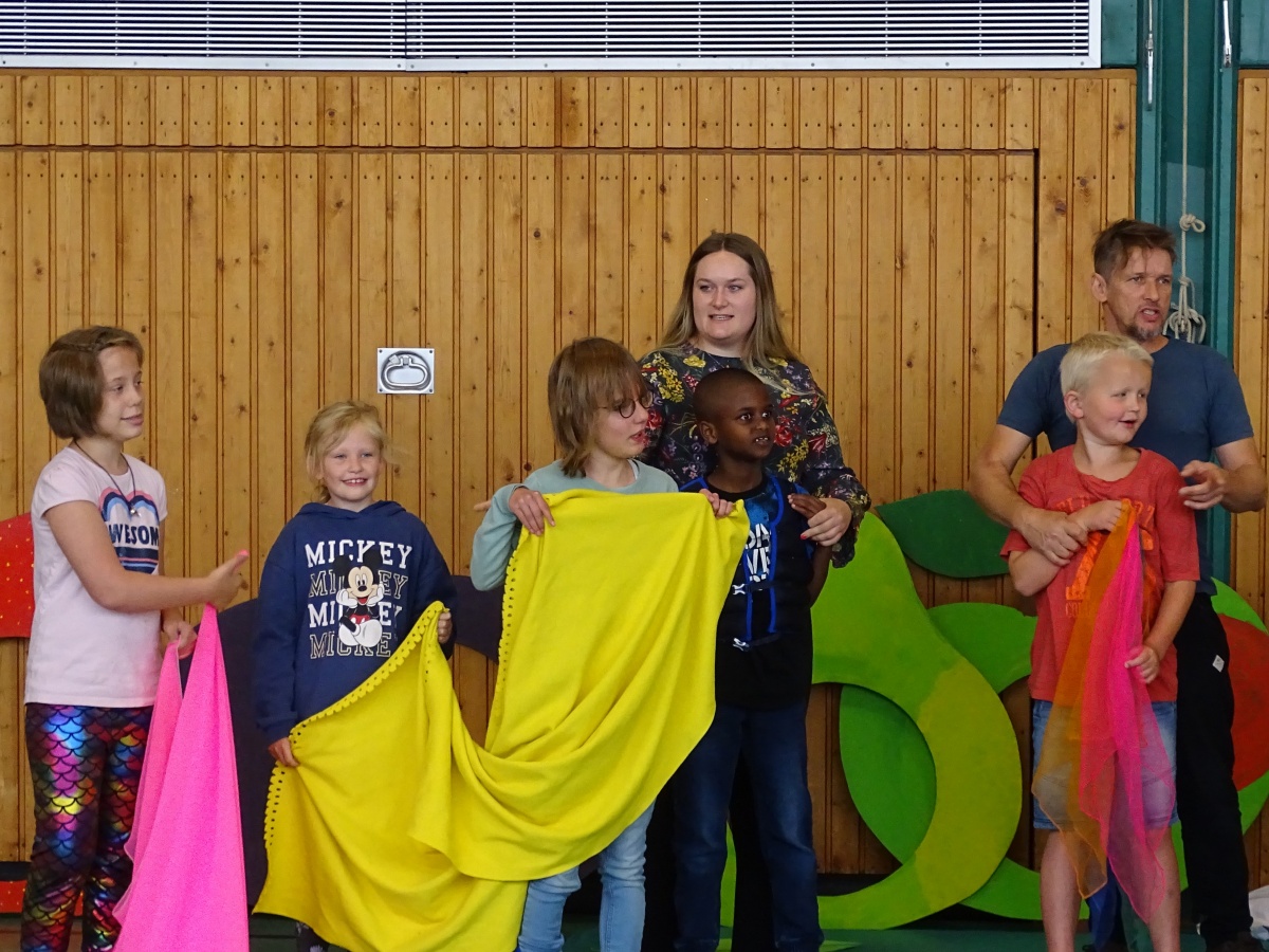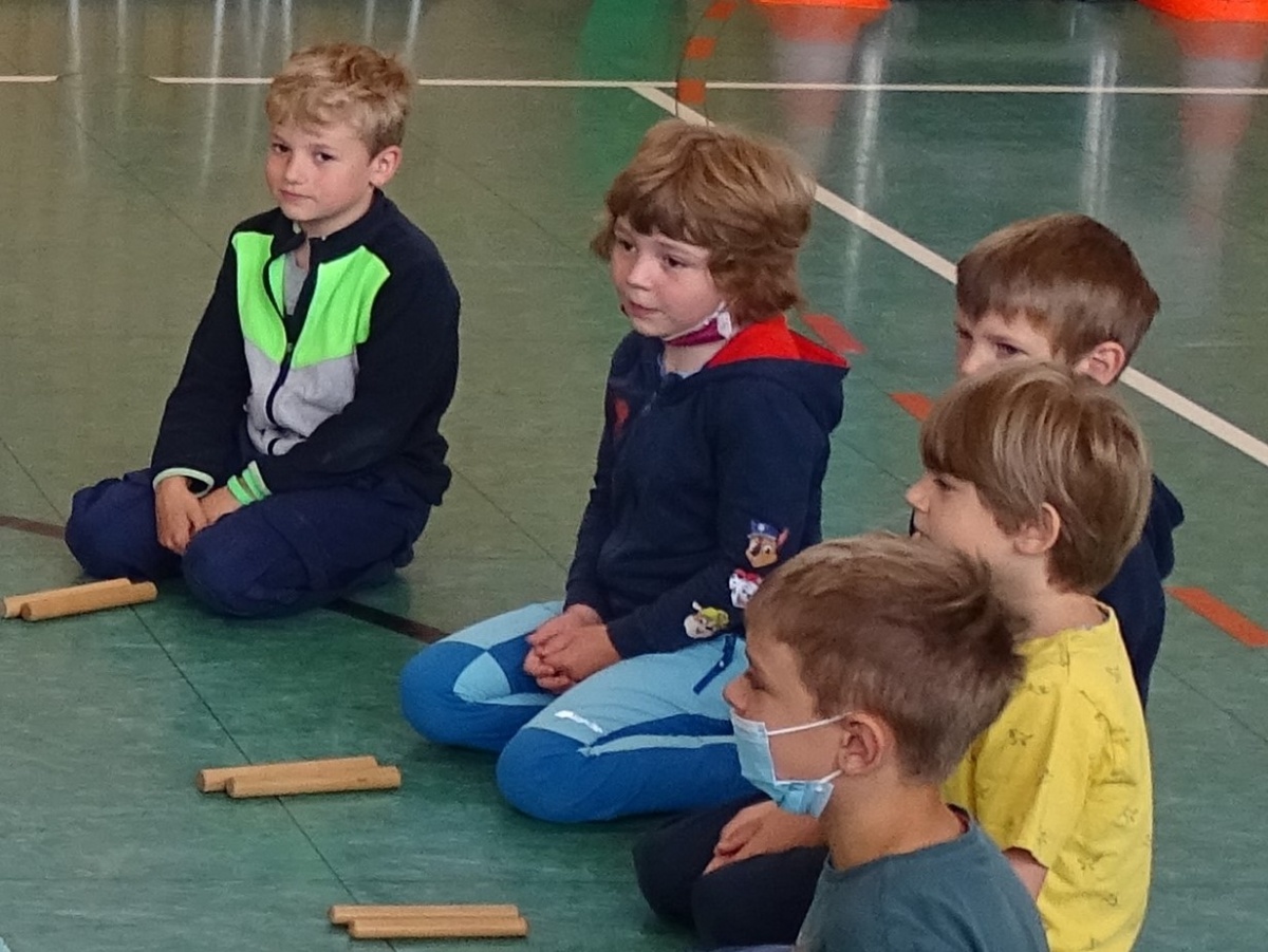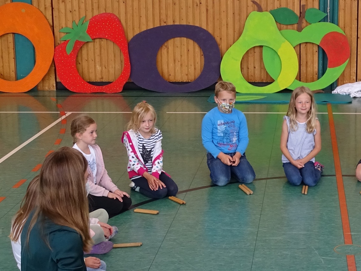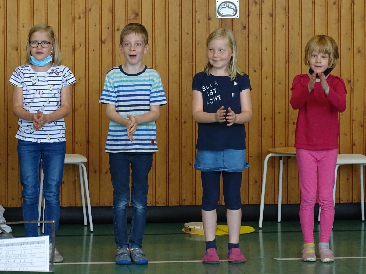 Unsere Klasse 1a freute sich mit allen Kindern auf die kommenden Ferien - auf das Spielen im Garten, auf das Planschen im Pool, auf warme Tage in der Sonne und laue Sommernächte am Grillfeuer! Was sie aber fürchten, sind Mücken! Mücken, die ihnen nachts den Schlaf rauben, und Mücken, die ihnen heftig juckende Stiche verschaffen: Die Kinder regten sich pantomimisch furchtbar auf und spielten mit Körperklängen: ''Rechts am Knie, links am Knie hab ich einen Mückenstich. Mann, das juckt wie verrückt!!! Immer stechen die nur mich!!! Nee, nee!!!''