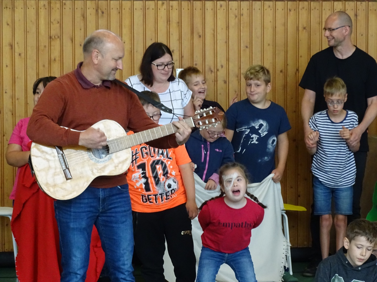 Unsere Mitschülerinnen und Mitschüler aus der Helga-Leinung-Schule trugen mit den Mitarbeiterinnen und Mitarbeitern und begleitet von tragenden Gitarrenklängen das Lied vom Anderssein vor: ''Ich bin anders als du bist anders als er ist anders als sie''. Ob sie strahlend in der ersten Reihe oder im Schutz der Arme der Erzieherinnen und Erzieher etwas weiter hinten standen, alle Zuschauerinnen und Zuschauer spürten, wie bewegend sie es fanden, auf einer Bühne vor Publikum zu stehen. Unter ihnen waren etliche Kinder, die auch unsere Schule verlassen und nach den Sommerferien ihre nächste besuchen.