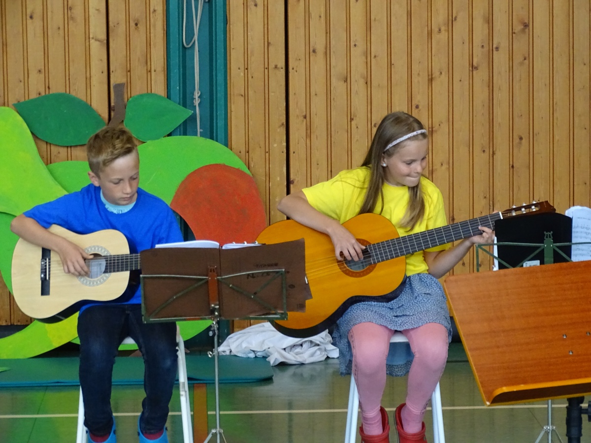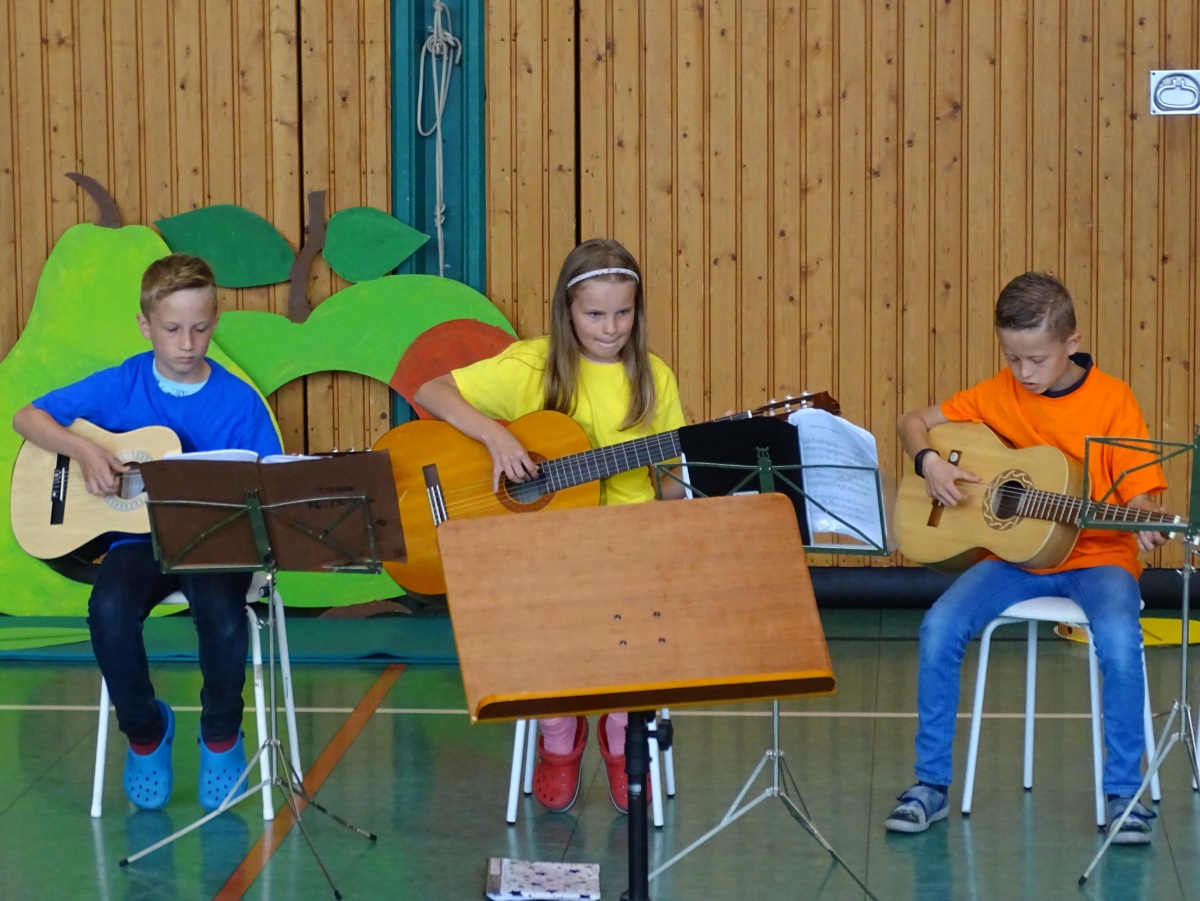 Der Leiter unserer Gitarren-AG war zwar leider verhindert, aber mutig und selbstbewusst spielten uns drei Kinder auch ohne seine Begleitung ihre Stücke. Genau aufeinander zu hören und gleichzeitig trotz Aufregung den Takt zu halten, ist nicht einfach! Diese drei gaben ihr Bestes und wurden mit lang anhaltendem Applaus belohnt.