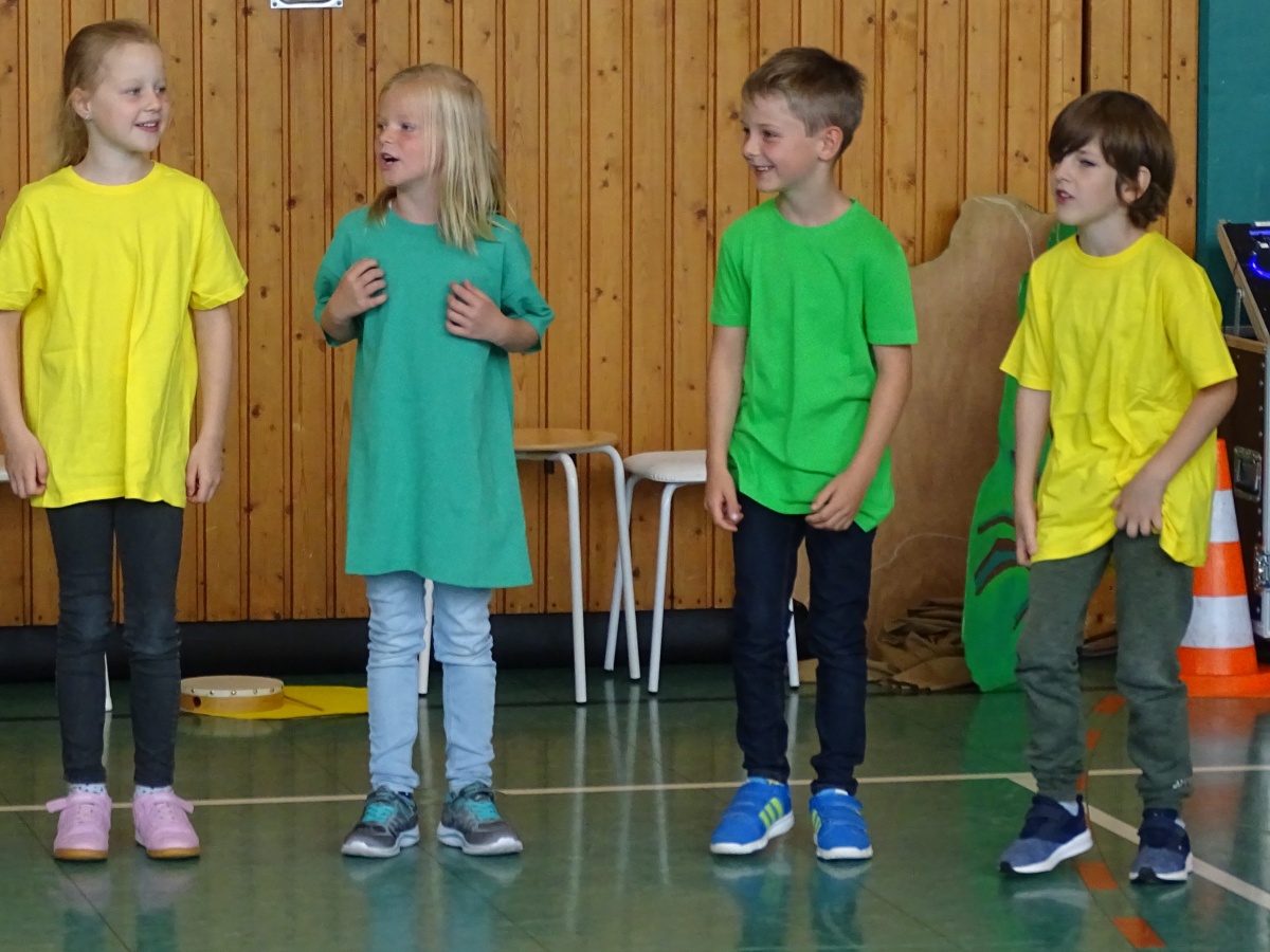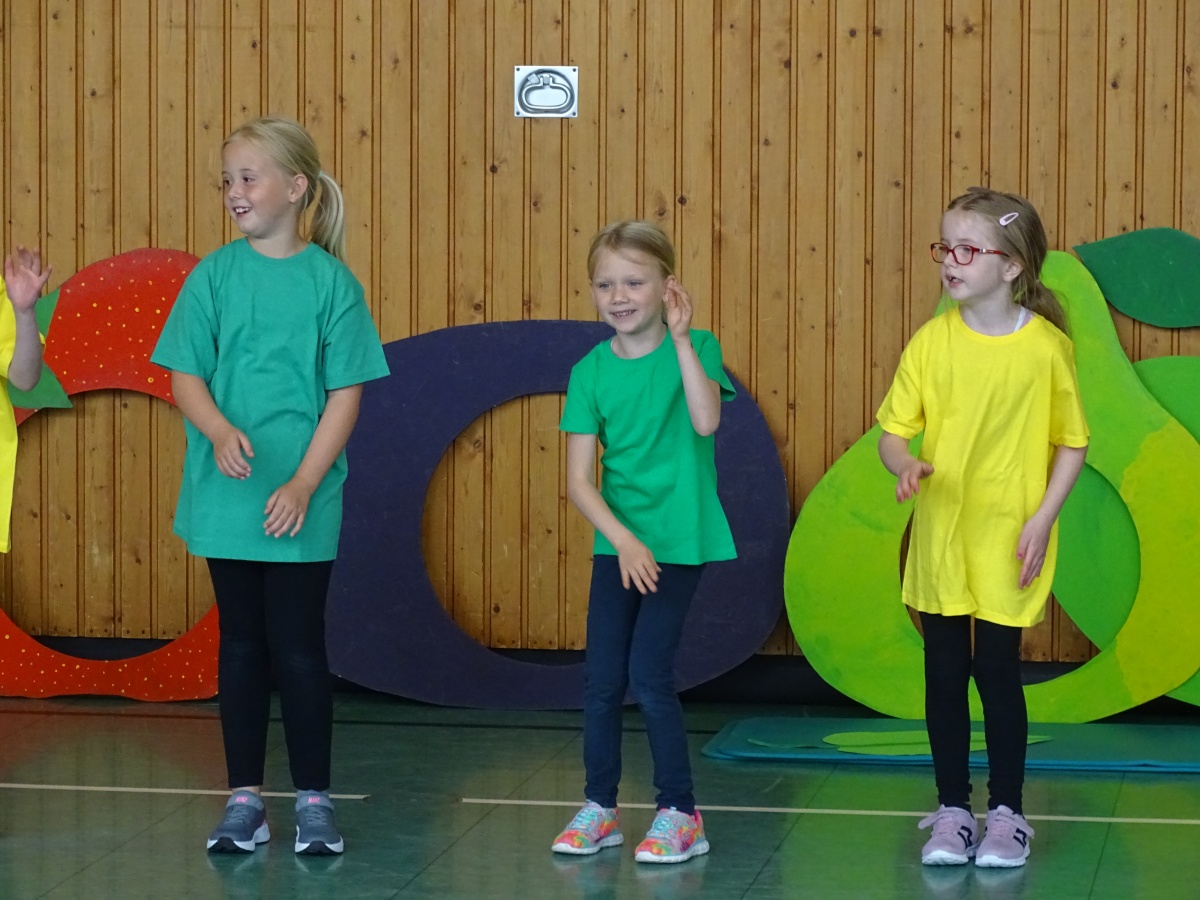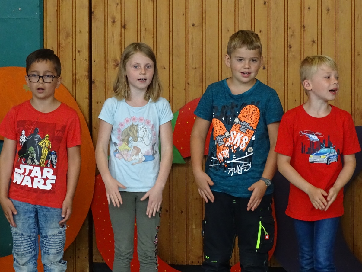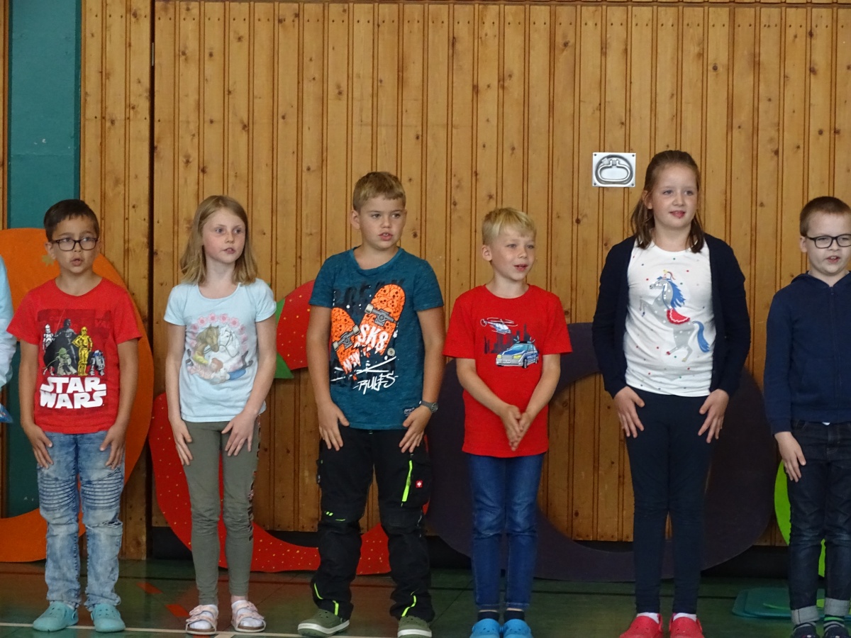 Eigens für heute hatten die Kinder unserer Klasse 2a alle Namen derer gelernt, die heute verabschiedet wurden. Ihre Lehrerin hatte die Namen so geordnet, dass sie im Spielstück ''Tschüss'' rhythmisch gut gesprochen werden konnten. Eine tolle Leistung, die von den angesprochenen Kindern mit bewegten Gesichtern und begeistertem Applaus sehr gewürdigt wurde.