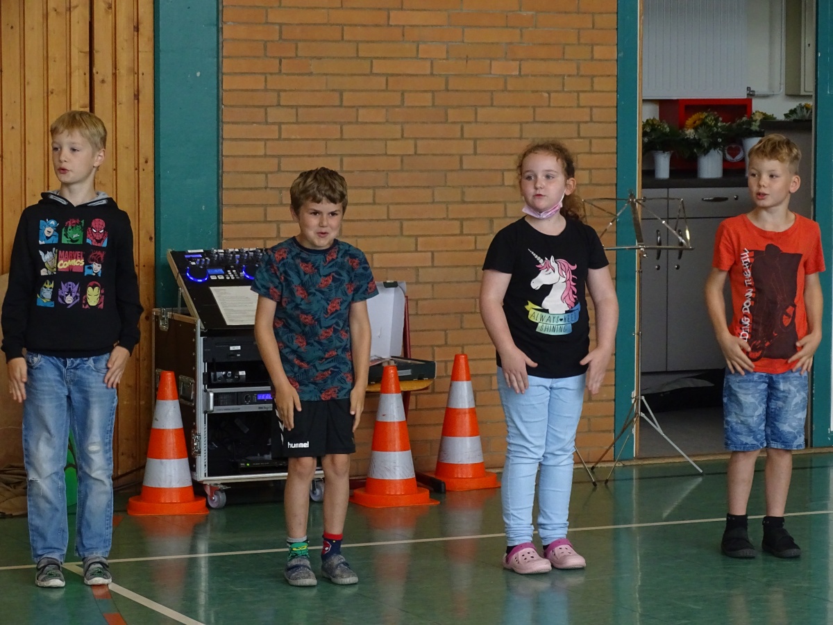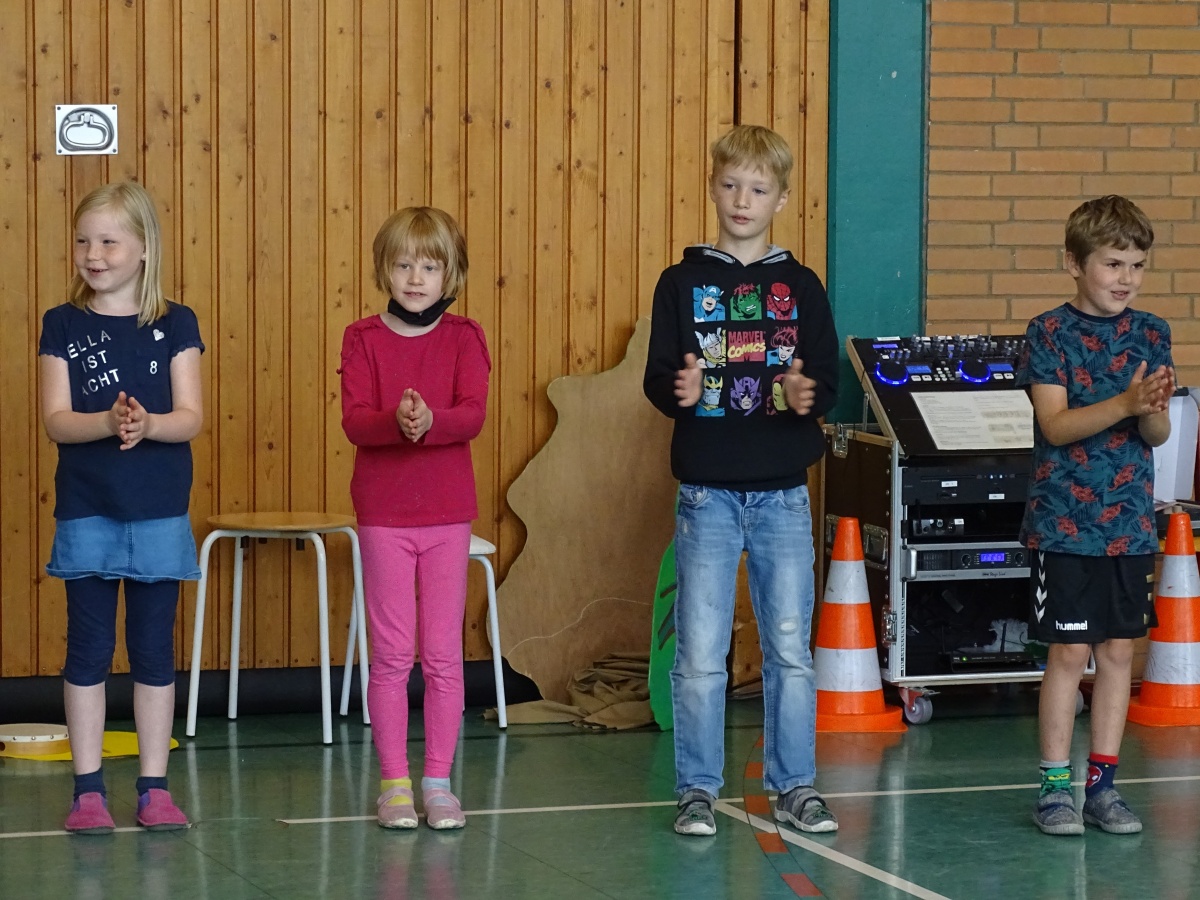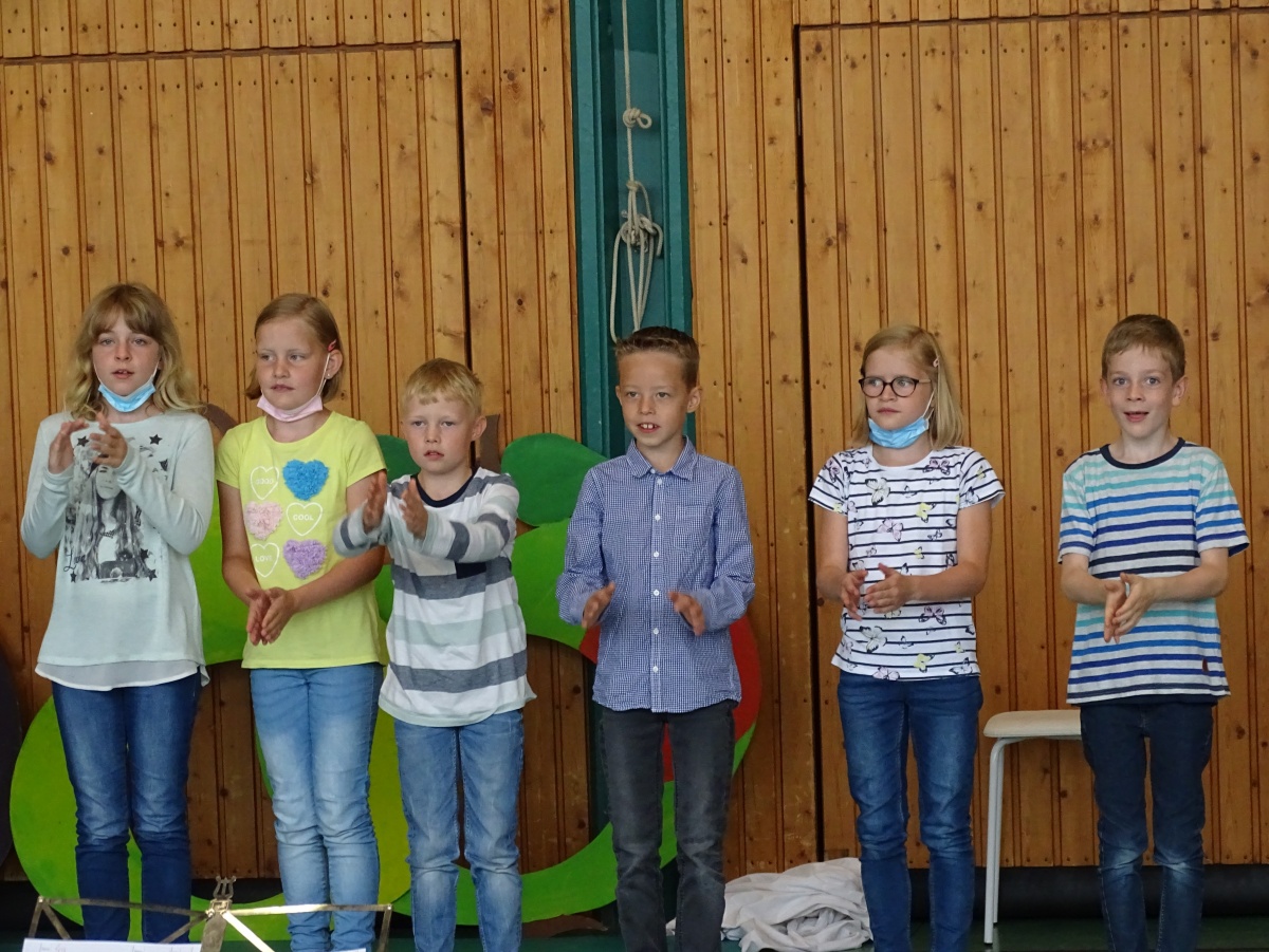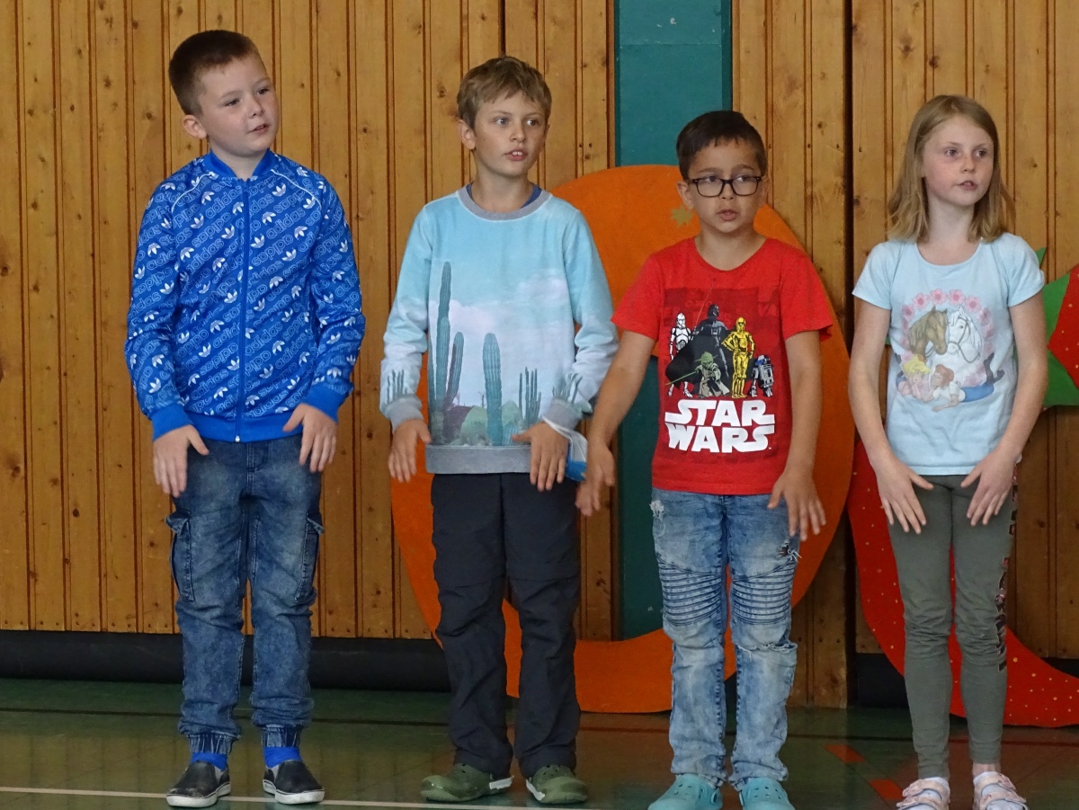 Eigens für heute hatten die Kinder unserer Klasse 2a alle Namen derer gelernt, die heute verabschiedet wurden. Ihre Lehrerin hatte die Namen so geordnet, dass sie im Spielstück ''Tschüss'' rhythmisch gut gesprochen werden konnten. Eine tolle Leistung, die von den angesprochenen Kindern mit bewegten Gesichtern und begeistertem Applaus sehr gewürdigt wurde.