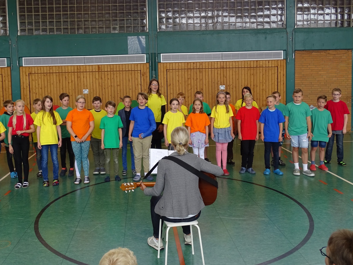 Es war einfach schön, endlich wieder einmal gemeinsam unser Schullied zu singen! Unsere Erstklässlerinnen und Erstklässler hatten es extra geübt und hörten zum ersten Mal, wie es klingt, wenn es aus über 100 Kehlen ertönt.