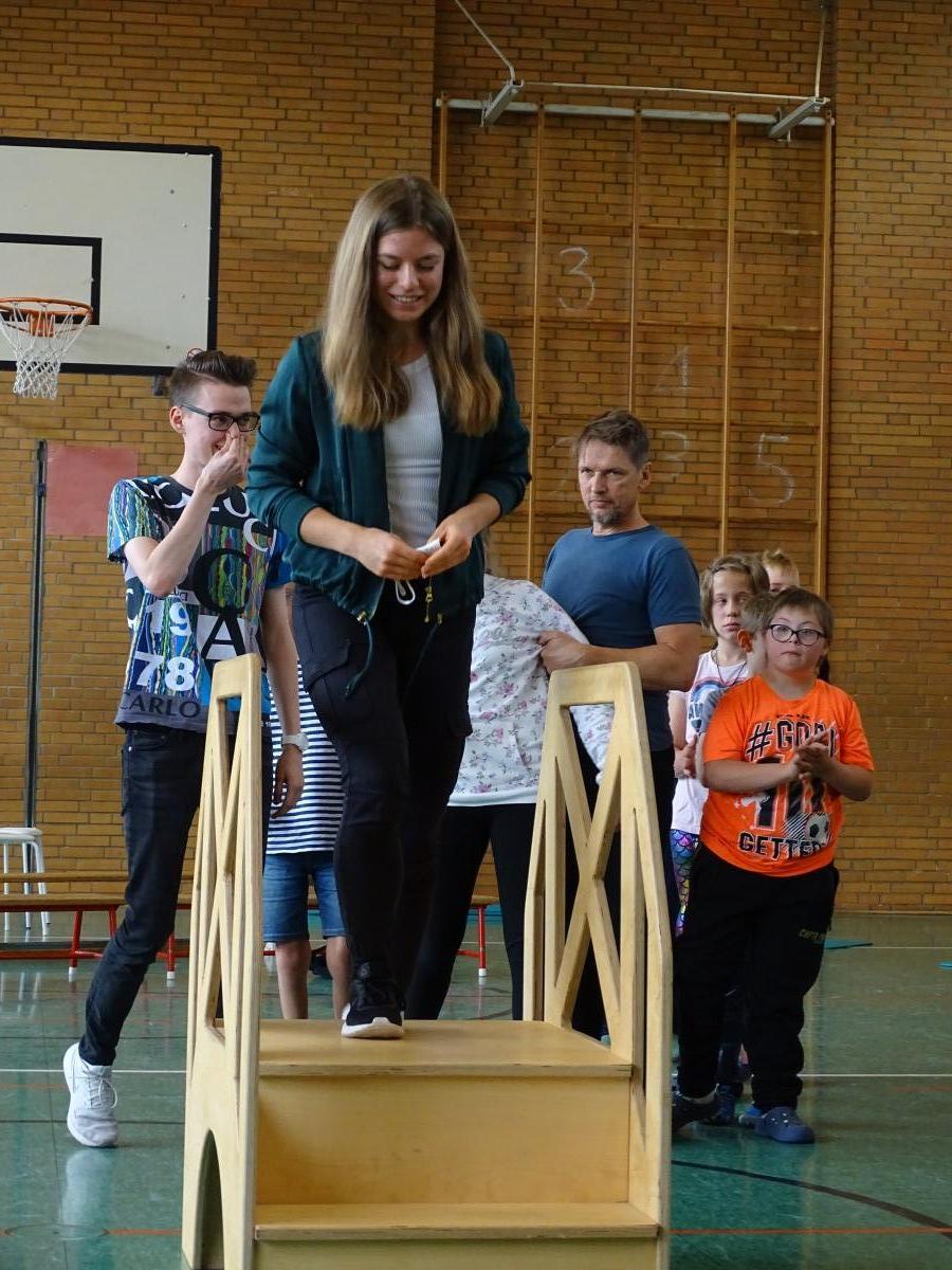 Bei der Einschulung geht bei uns jedes Kind als Symbol für den Schuleintritt über eine Brücke auf die Bühne. Dort wird es von seiner Klassenlehrerin in Empfang genommen. Heute gingen die Viertklässlerinnen und Viertklässler unserer Grundschule und die Kinder der Helga-Leinung-Schule wieder über diese Brücke - als Symbol dafür, dass sie jetzt aus unserer Schule hinausgehen und in eine neue hinein. Einige Kinder machten diesen Schritt langsam und vielleicht etwas wehmütig, anderen sprangen gespannt auf die Brücke hinauf und kraftvoll wieder hinunter, vielleicht ein Zeichen dafür, dass sie sich auf alles Neue freuen und es kaum erwarten können. Wir wünschen es ihnen!