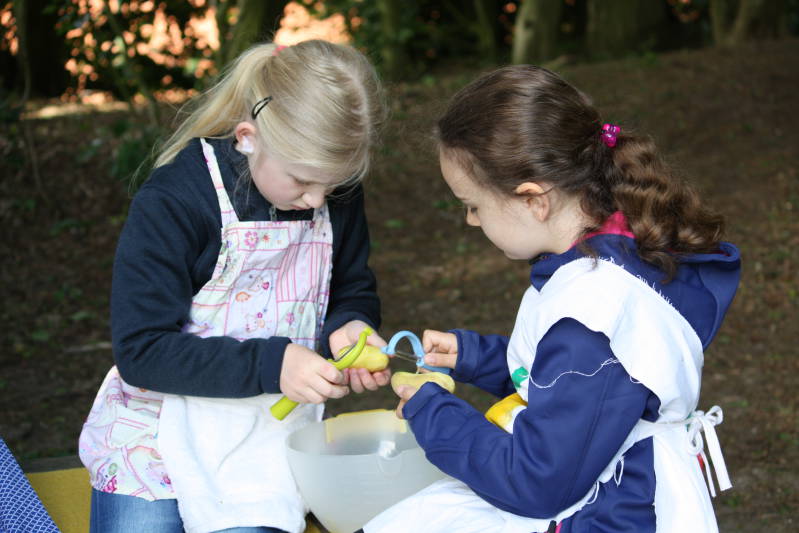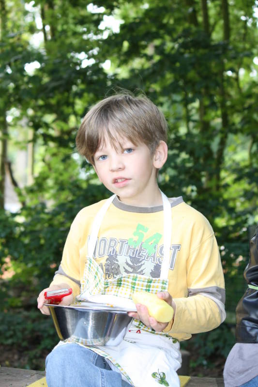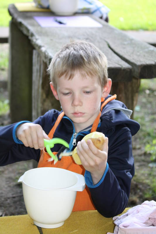 Der Duft von Kartoffelpuffern zog am Mittwoch der ersten Juniwoche über unseren Schulhof: Gut ausgestattet mit Schürze und Schälmessern hatten die Kinder der Klasse 2b eine ganze Stunde lang reichlich Kartoffeln geschält, gerieben, gekocht, gestampft und püriert.