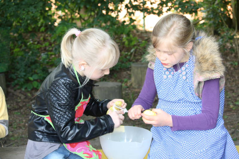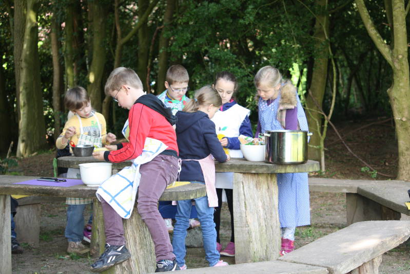 Anschließend gab es zahllose Puffer, die draußen vor ihrem Klassenfenster auf mehreren Herdplatten gebacken wurden und nicht nur die Kinder der eigenen Klasse satt machten. Außerdem gab es zwei große Töpfe Kartoffelsuppe. Dazu luden die Zweitklässler die Kinder ihrer Parallelklasse ein. Die kamen mit gutem Hunger und standen nach etlichen Tellern Suppe vom gemeinsamen Essen zufrieden wieder auf.