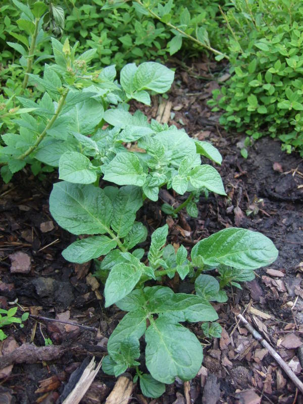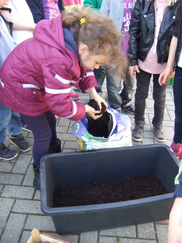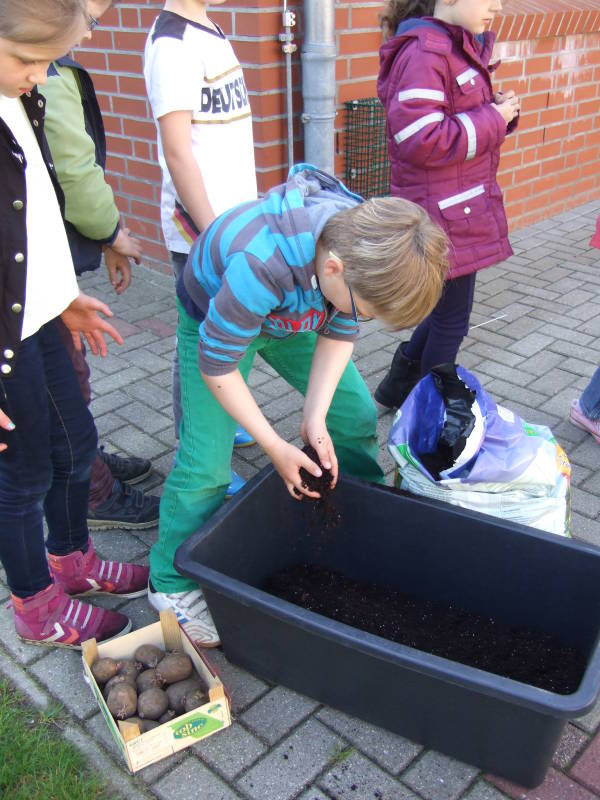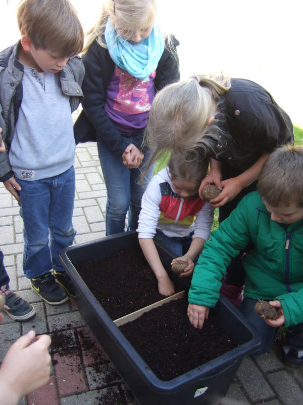 Ende April hatten die Kinder der 2b von ihren Eltern einen großen Pflanzkübel, Erde und verschiedene Sorten Saatkartoffeln mit Namen wie „Blauer Schwede“, „Linda“, Nicola“ und „Sieglinde“ geschenkt bekommen und die Knollen in die Erde gesetzt.