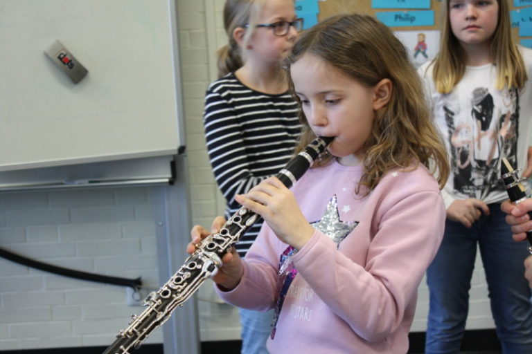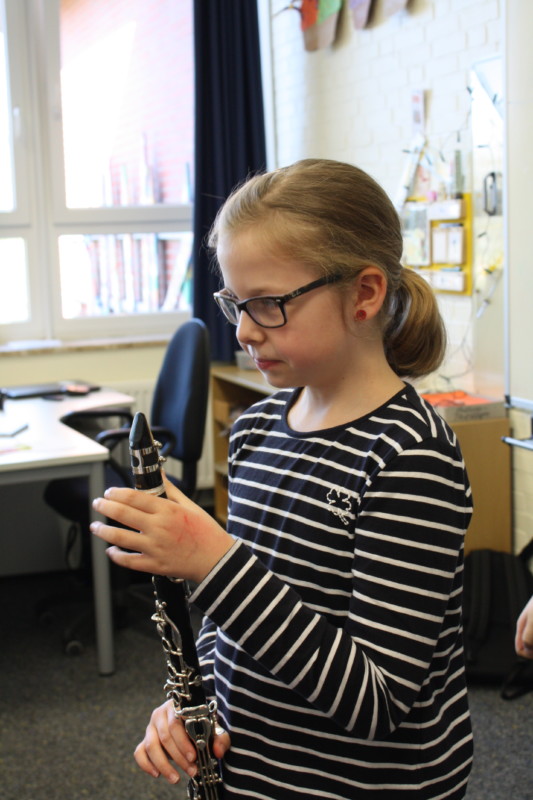 Nach einem kleinen Konzert, das von der Lehrerin Frau Höver dirigiert wurde, durften unsere Viertklässler/innen selbst einmal ausprobieren, ob sie den Instrumenten einen Ton entlocken konnten. Da röteten sich aber so manche Gesichter – denn das Blasen ist nicht so einfach! Und einen schönen sauberen Ton zu erzeugen, kostet viel Übung! Oder ein bisschen Talent! Die Schüler/innen aus Sittensen gaben gute Tipps und halfen sehr geduldig.