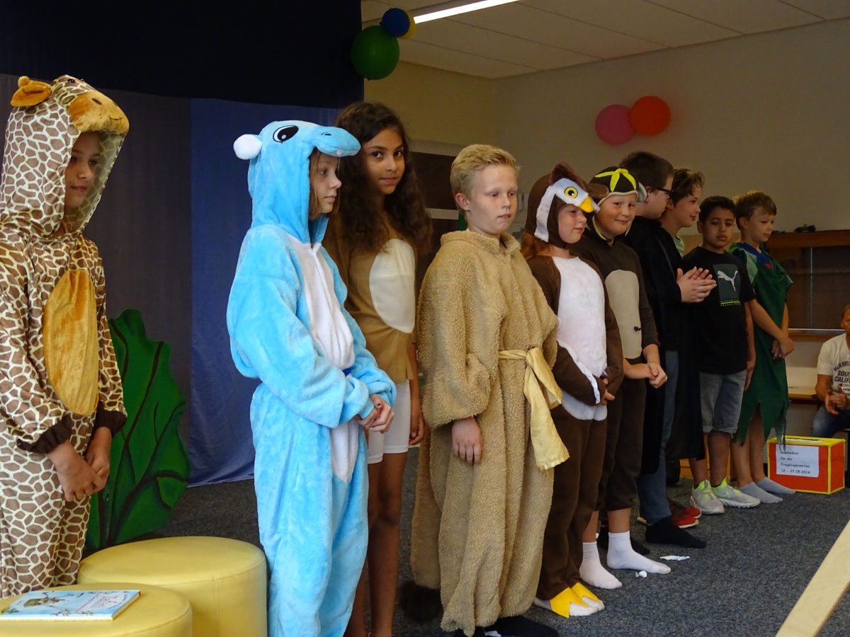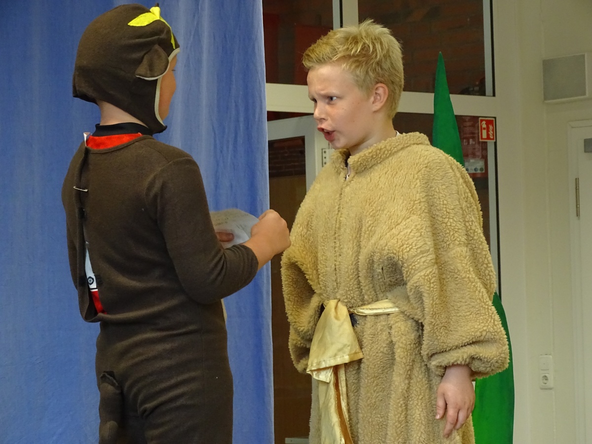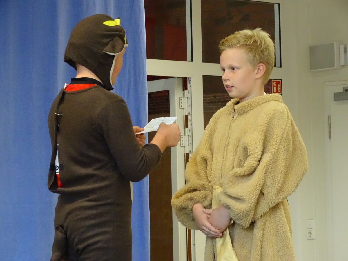 Nachdem die beiden Kollegien mit der Klasse 4 für alle Gäste und mit ihnen zusammen das Schullied gesungen hatten, brachte unsere 4. Klasse ihr Theaterstück ''Die Geschichte vom Löwen, der nicht schreiben konnte'' auf unsere Bühne. Dieses Stück machte liebe- und humorvoll deutlich, wie wichtig es ist, seine Gefühle und Empfindungen auszudrücken - sei es mit Worten und Gesten, sei es mit Briefen und Texten oder sei es mit Bildern und Geschenken.