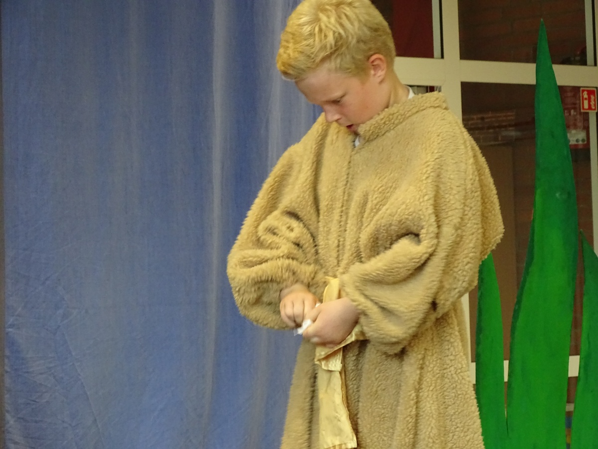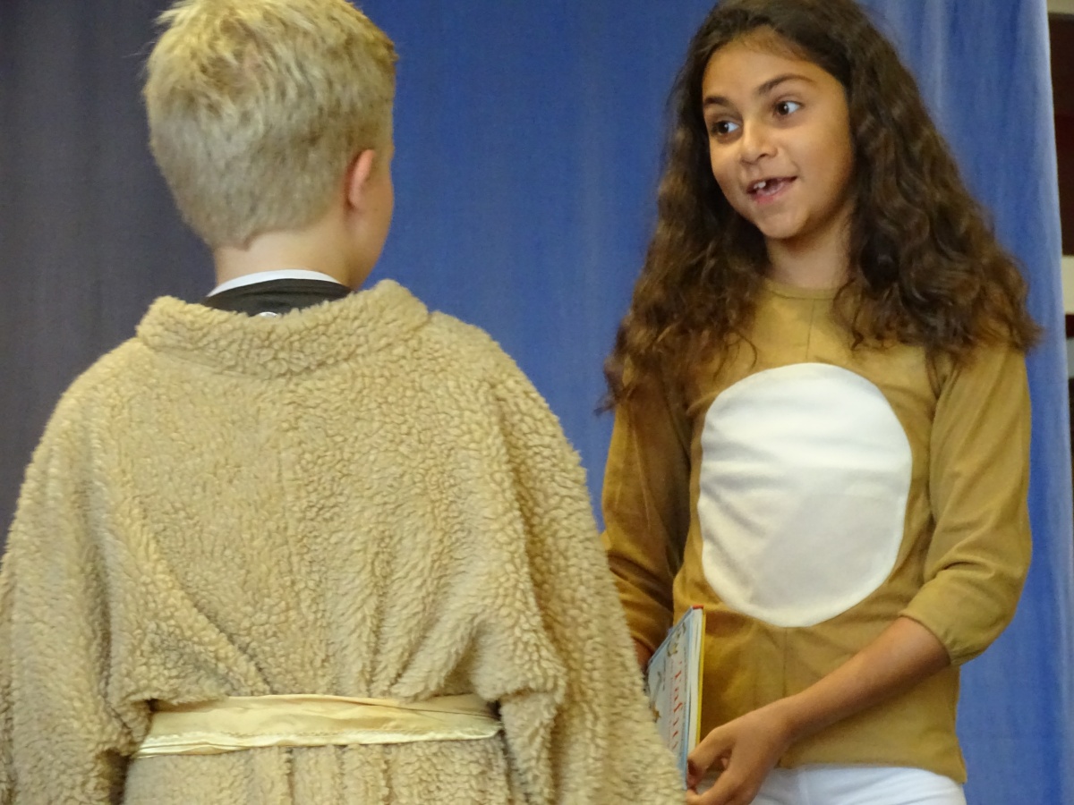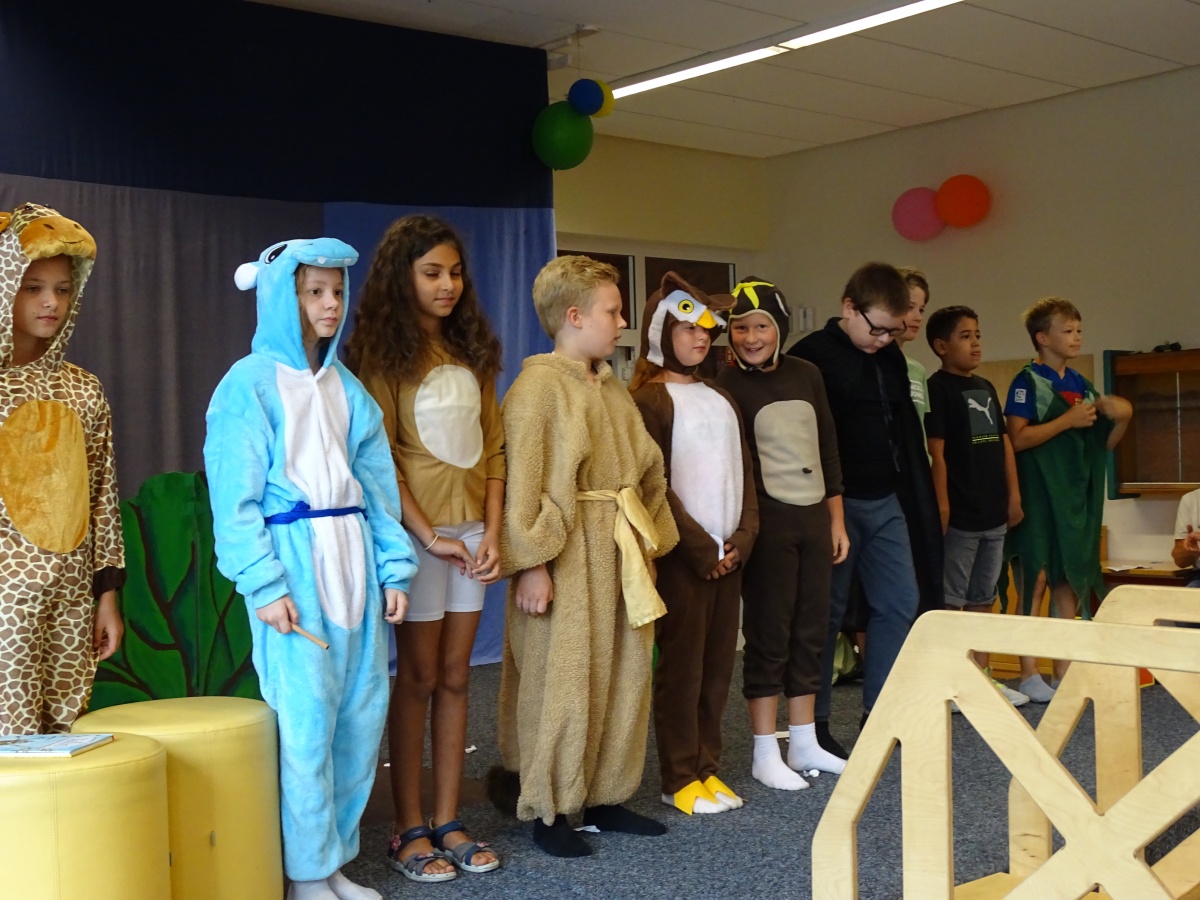 Nachdem die beiden Kollegien mit der Klasse 4 für alle Gäste und mit ihnen zusammen das Schullied gesungen hatten, brachte unsere 4. Klasse ihr Theaterstück ''Die Geschichte vom Löwen, der nicht schreiben konnte'' auf unsere Bühne. Dieses Stück machte liebe- und humorvoll deutlich, wie wichtig es ist, seine Gefühle und Empfindungen auszudrücken - sei es mit Worten und Gesten, sei es mit Briefen und Texten oder sei es mit Bildern und Geschenken.