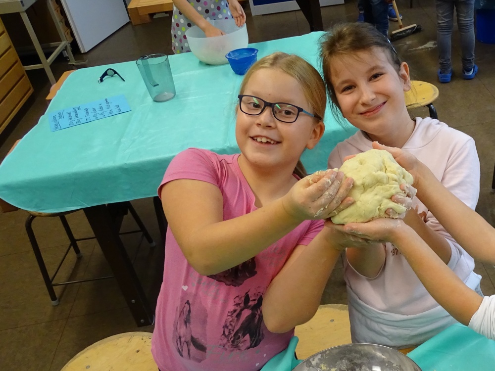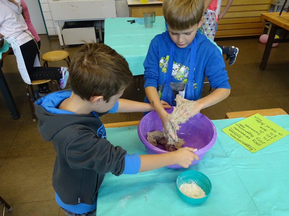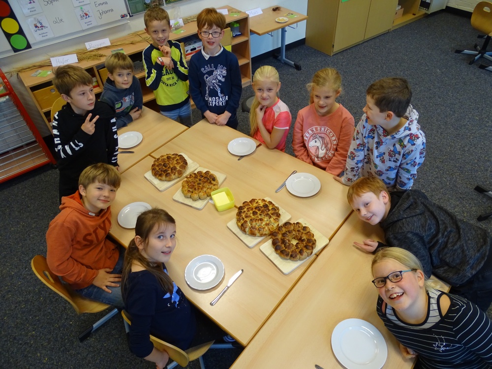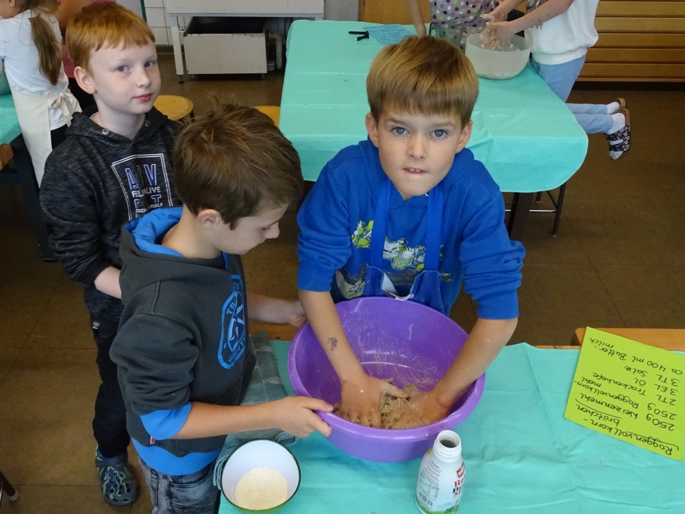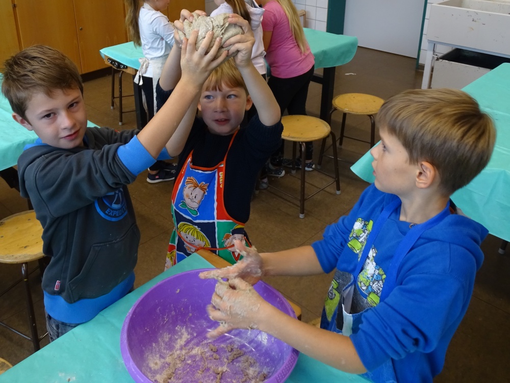 Die Getreidefelder sind abgemäht, das Korn ist eingefahren und wird zu Mehl verarbeitet. In Bäckereien werden Brot und Brötchen, Kuchen und Kekse gebacken ... Diesen langen Weg vollziehen auch alle Grundschulkinder nach - so jetzt auch unsere 3. Klassen. Als Abschluss dieses Themas haben sie aus verschiedenen Mehlsorten Brötchen gebacken.