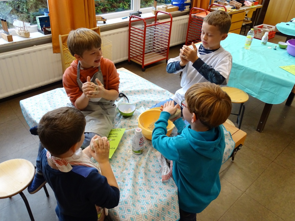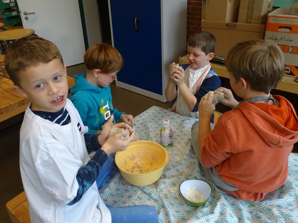Selbstgemachtes schmeckt immer am besten und so aßen die Kinder am nächsten Tag ihre eigenen Brötchen mit Hochgenuss! Erst recht in der Gemeinschaft!