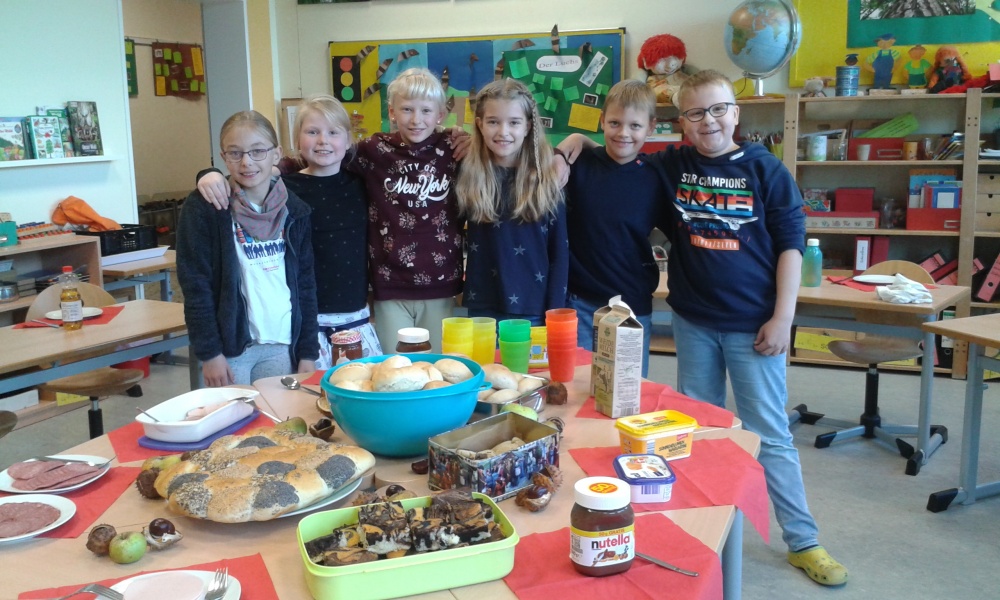 Hier die Kinder einer 4. Klasse, die das Tischdecken für ihre Mitschülerinnen und Mitschüler übernommen hatten. Die Kinder der Klasse hatten sich das gemeinsame Frühstück gewünscht und mit Hilfe ihrer Eltern viele Köstlichkeiten zusammengetragen: 20 Eier wurden verspeist - gekocht oder als Rührei zubereitet-, 4 Liter Milch getrunken, viele viele Brötchen mit Wurst gegessen, ein großes Glas Nutella geleert und Haferkekse und Marmorkuchen als Nachtisch genascht.