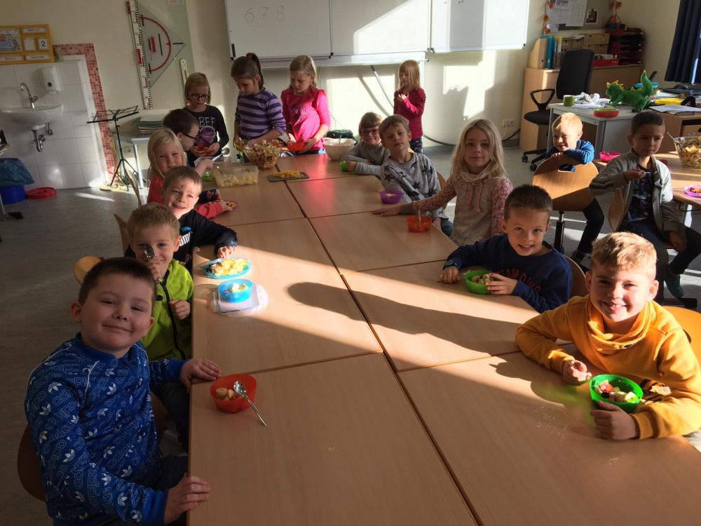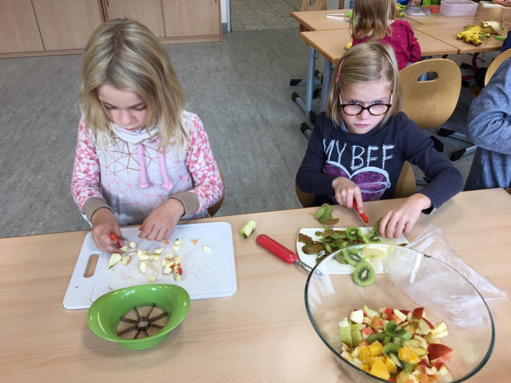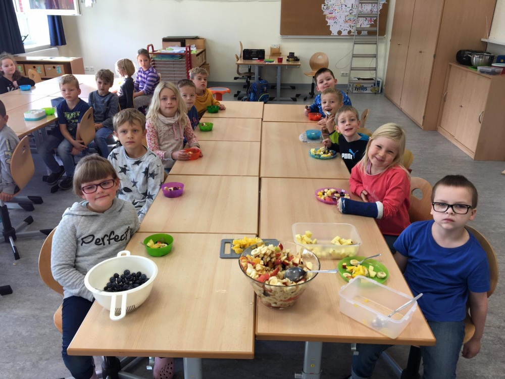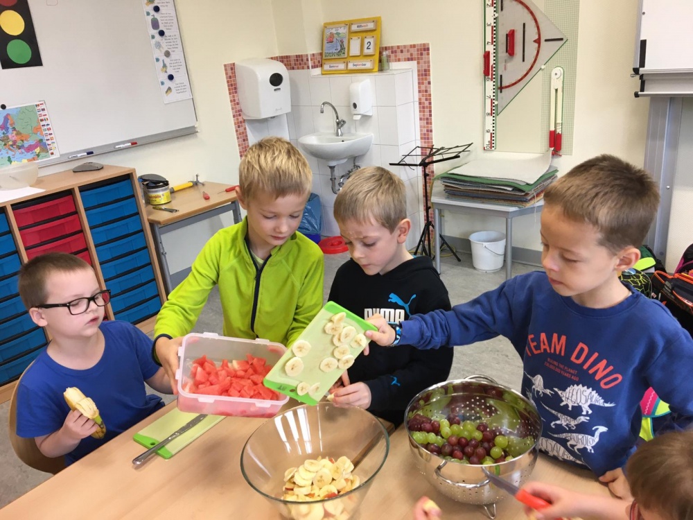 Unsere 1. Klasse hat gemeinsam große Mengen von Obstsalat zubereitet und miteinander gegessen.