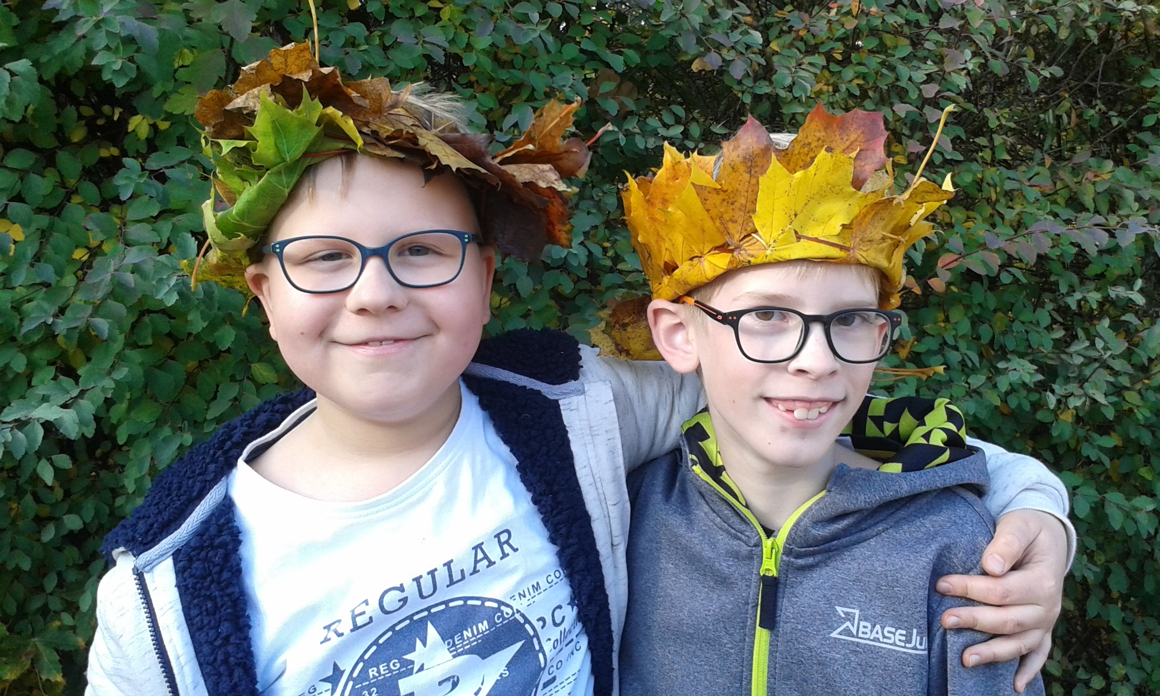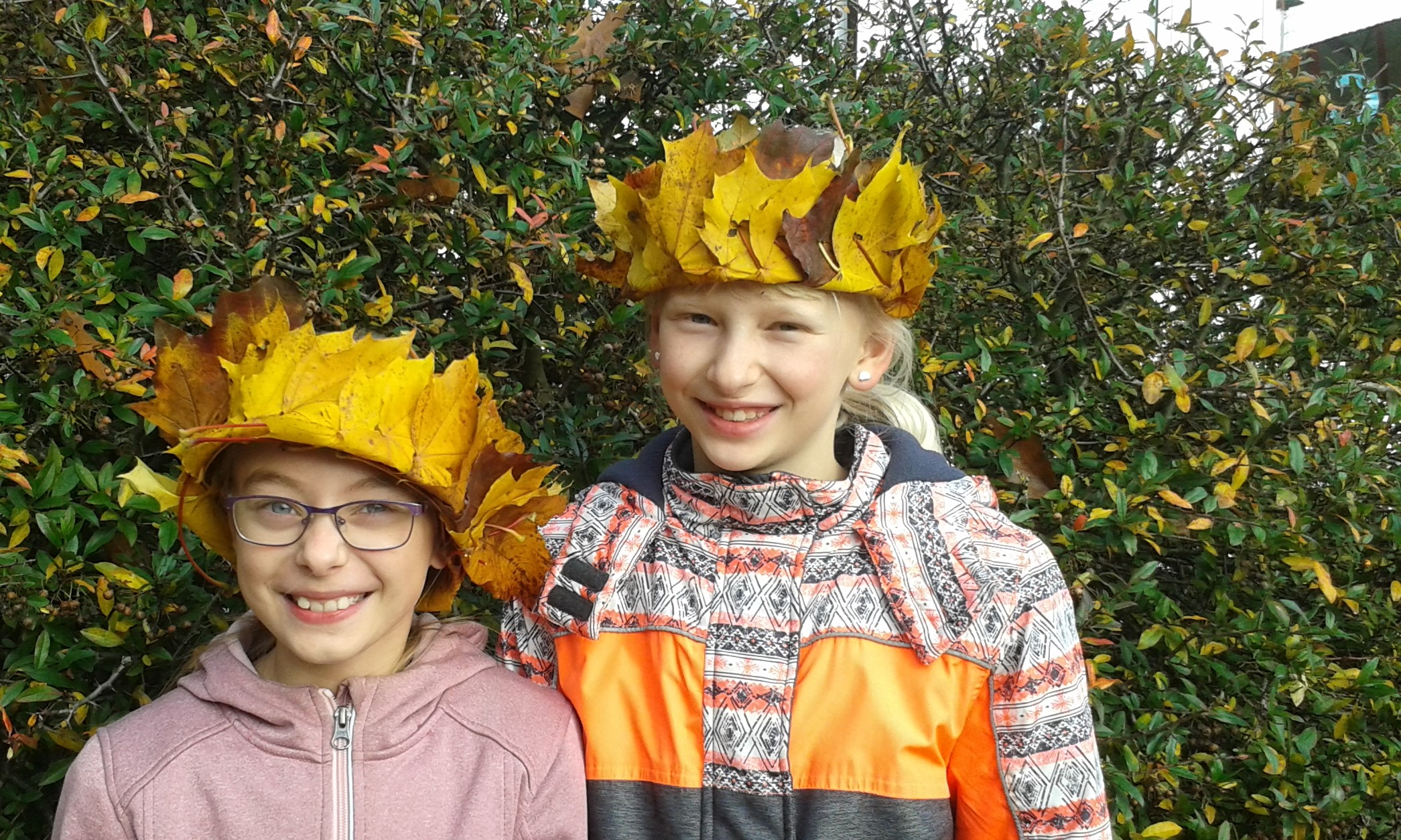 Die Schule hat wieder angefangen, alle Kinder dürfen kommen und der goldene Oktober lockt sie in den Pausen nach draußen zum gemeinsamen Spiel, zum Schaukeln, Fußballspielen und Einradfahren. Einige Kinder sammelten jetzt die schön festen, fast ledrigen und langstieligen Blätter des Ahorns und steckten sie zu Kronen zusammen.