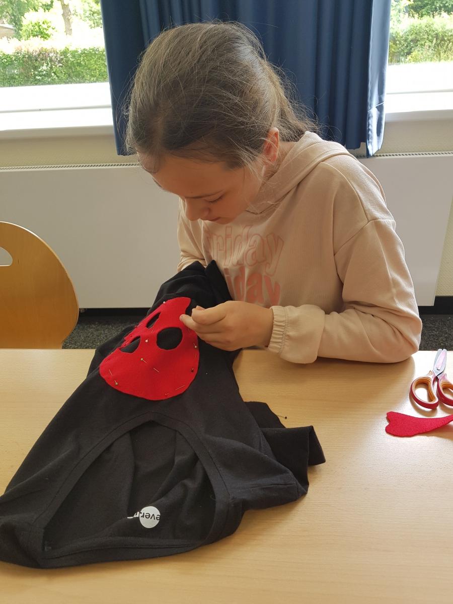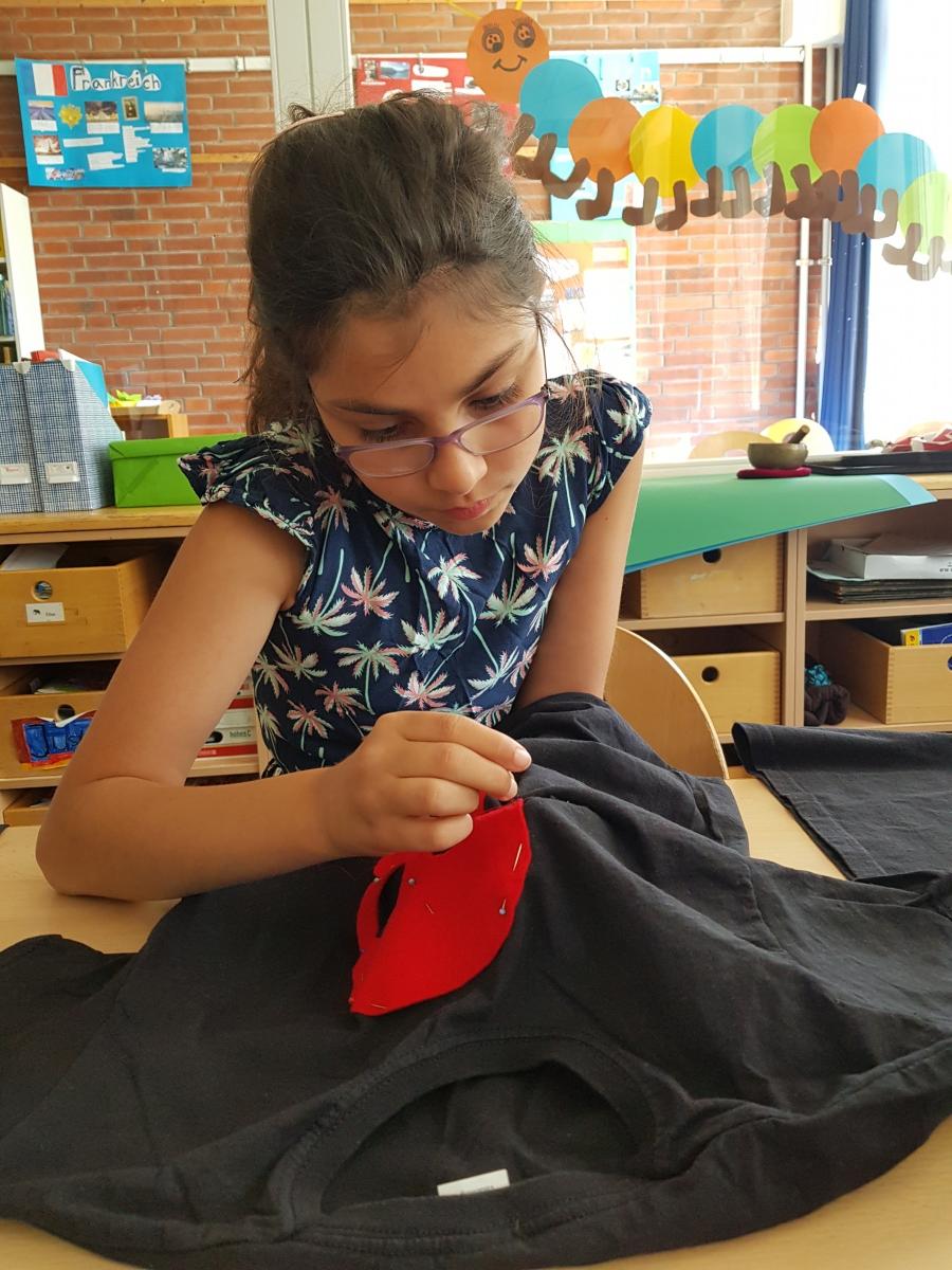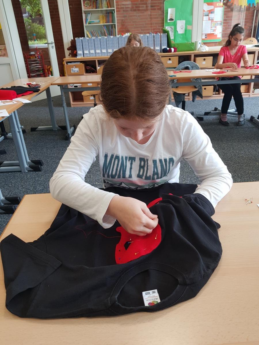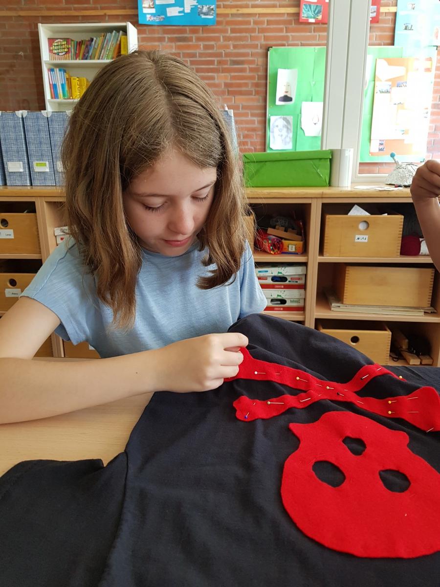 Manche Kinder unserer Klasse 4a nähten sich ihre Totenkopf-T-Shirts unter Anleitung von Frau Pohl selbst.