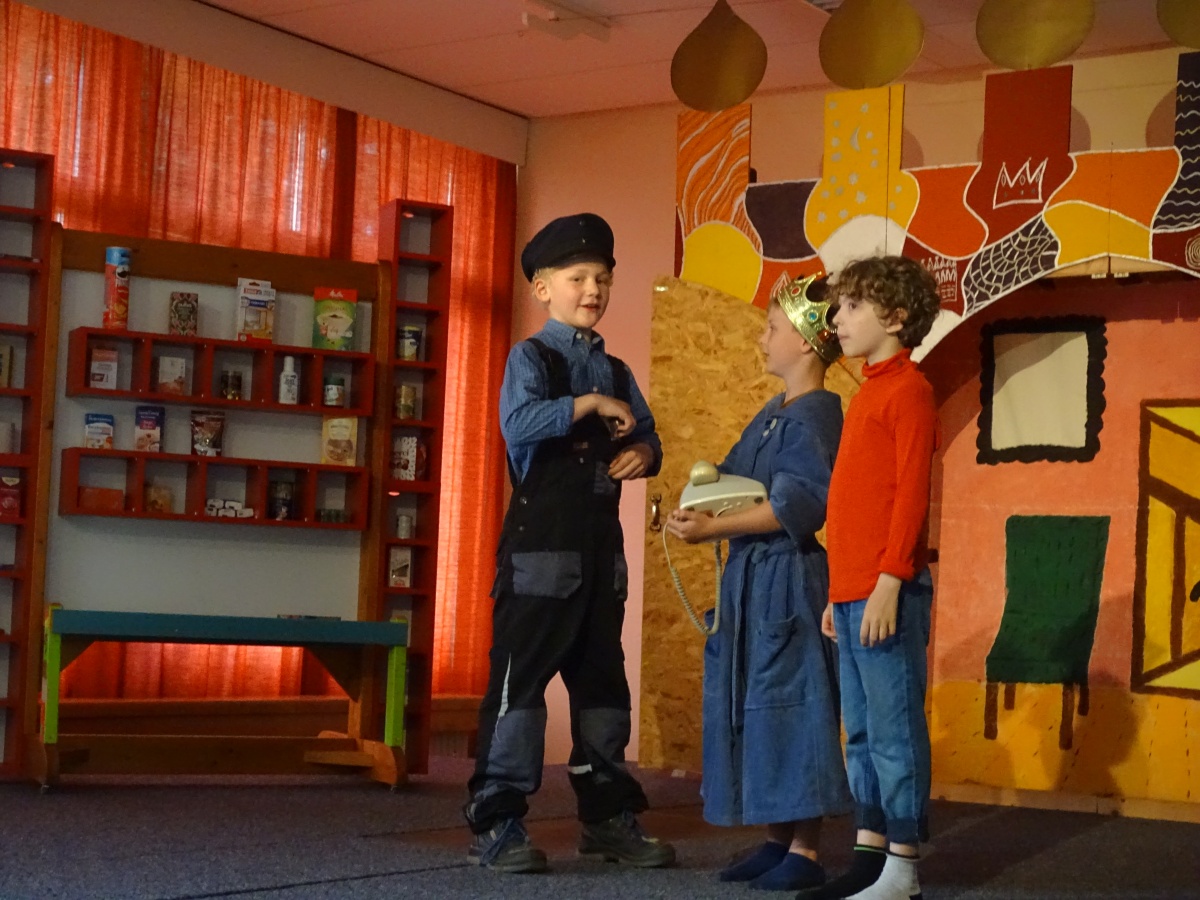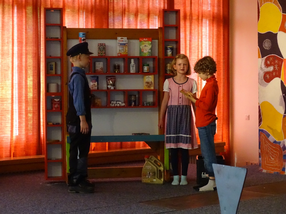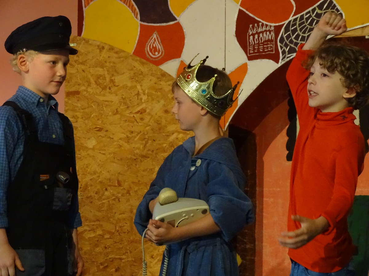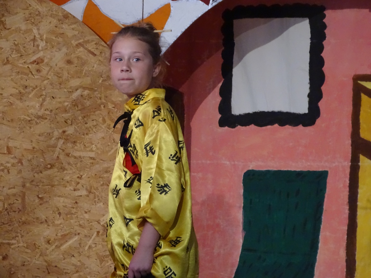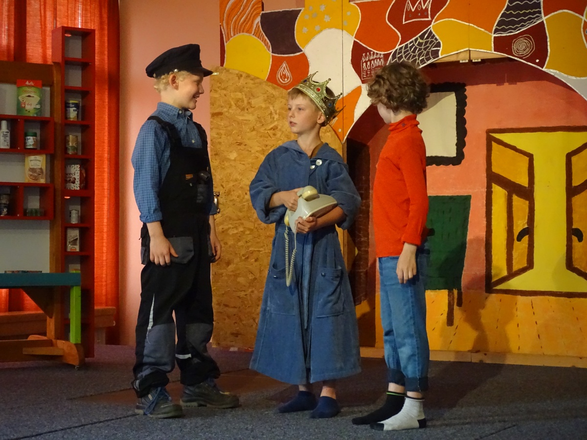 Für dieses gemeinsame Stück wurde alles einbezogen, was unsere Schule sowieso schon an Theater-Requisiten zu bieten hat: die Schlosskulisse auf der Bühne, die heute mal das Zuhause des Königs von Lummerland darstellte, mal den Palast der Kaiserin von China und schließlich die Tür zur Drachenschule. Unser Kaufmannsladen, den erst kürzlich unser Hausmeister Herr Kaiser mit der finanziellen Unterstützung unseres Fördervereins für unseren Mathematikunterricht gebaut hatte, kam als ''Laden von Frau Waas'' richtig gut zur Geltung und auch die Lok, die schon vor vielen Jahren einmal für ein Stück angefertigt worden war, hatte frisch restauriert ihren großen Auftritt.