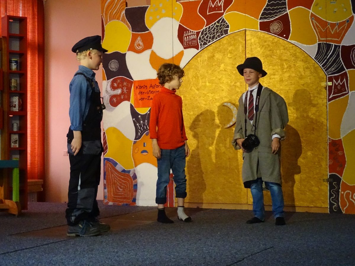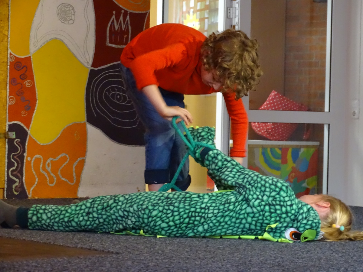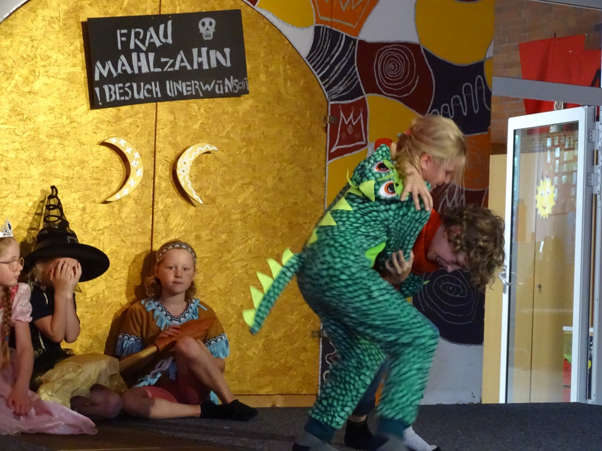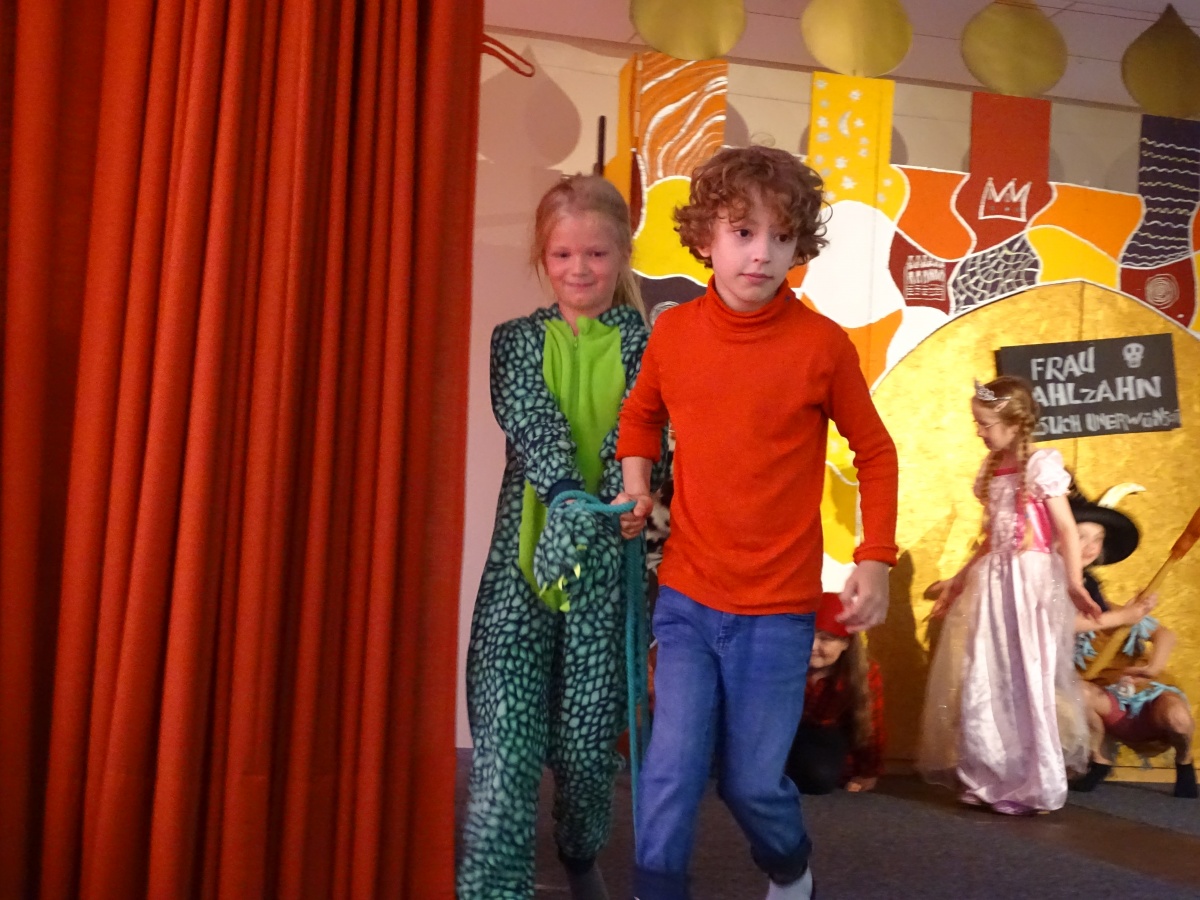 Die Kinder der Klasse 2a verteilten untereinander Rollen, übten Texte und probten oft das laute, deutliche Sprechen und ausdrucksstarke Spielen auf unserer Bühne. Besonders großen Spaß hatten sie beim Proben der Kampfszenen zwischen Jim Knopf und Frau Mahlzahn. Es sollte gefährlich aussehen, durfte es für die beiden Kampfhähne in Wahrheit aber auf keinen Fall sein. Manche Kinder zeigten hierbei richtige Trainer-Qualitäten.