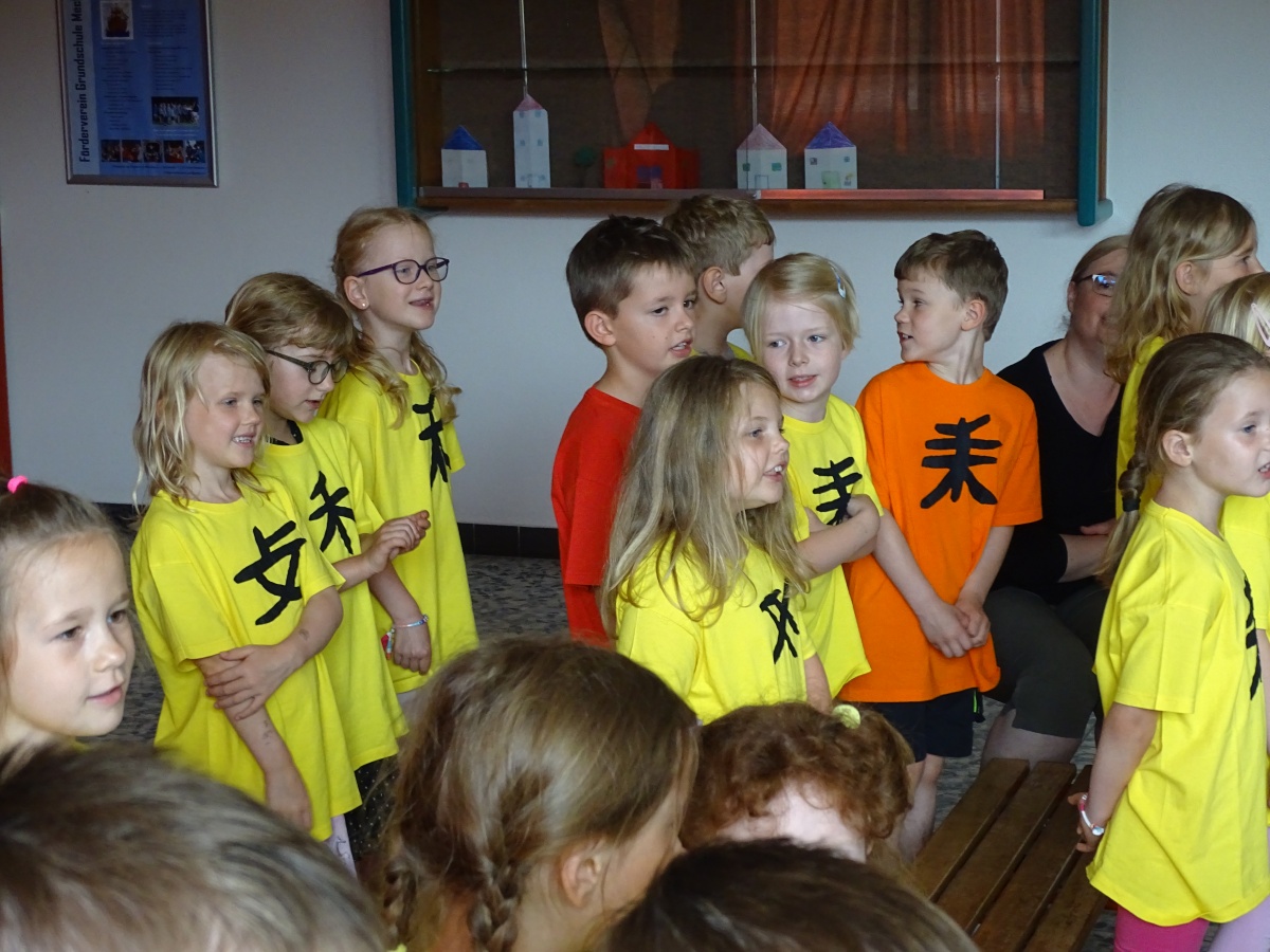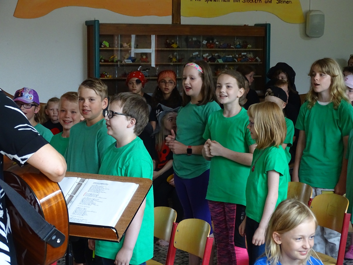 Für die gesangliche Gestaltung hatte Frau Pohl für jede Klasse unserer Schule ein passendes Lied ausgesucht. Die Kinder der Klasse 2b übten das Lummerland-Lied „Eine Insel mit zwei Bergen“. Unsere ersten Klassen sangen für den Einzug der beiden Hauptakteure in das Land Mandala ein Kinderlied, das von China handelt. Für die Strandszene sangen die Kinder unserer 3. Klasse ''Wenn der Sommer kommt'' von Rolf Zuckowski und das Piratenlied ''Alle, die mit uns auf Kaperfahrt fahren'' konnten die Sängerinnen und Sänger unserer Klassen 2a und 4a sogar mit einem Cup-Song-Rhythmus begleiten.