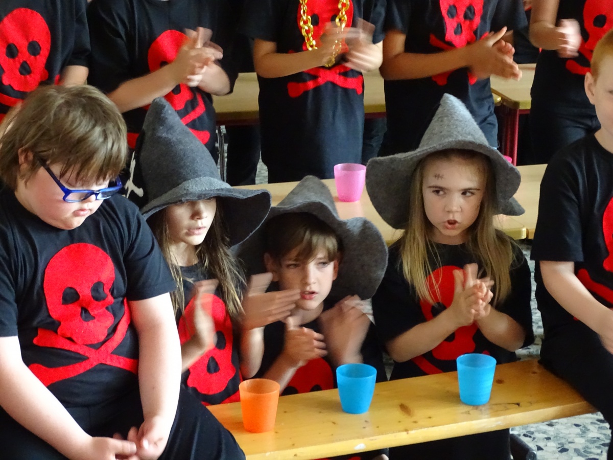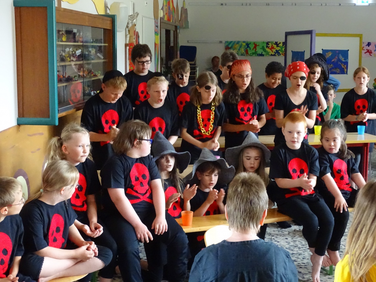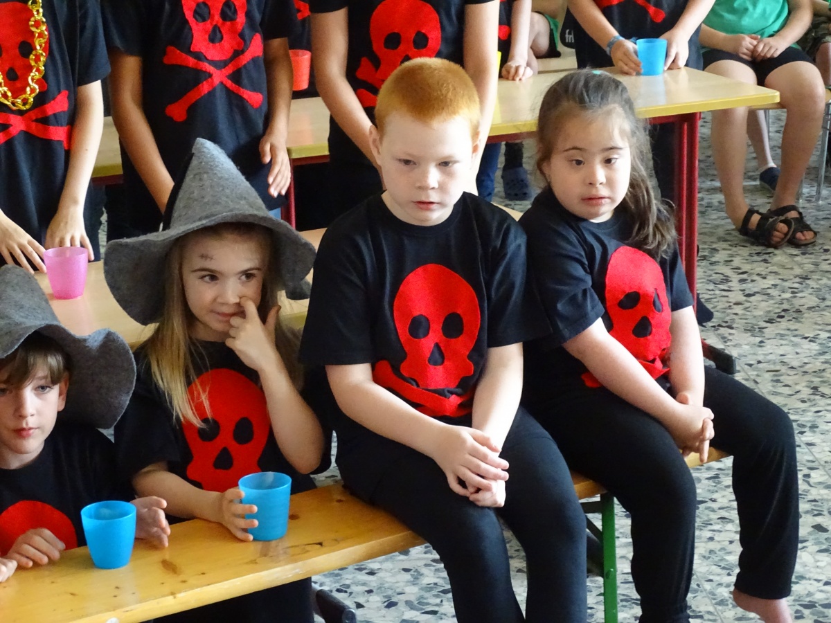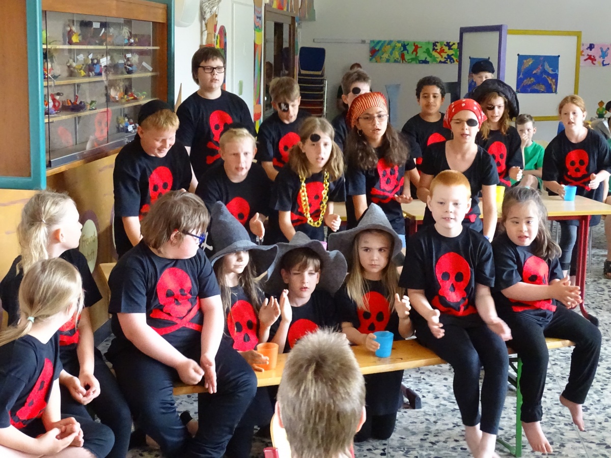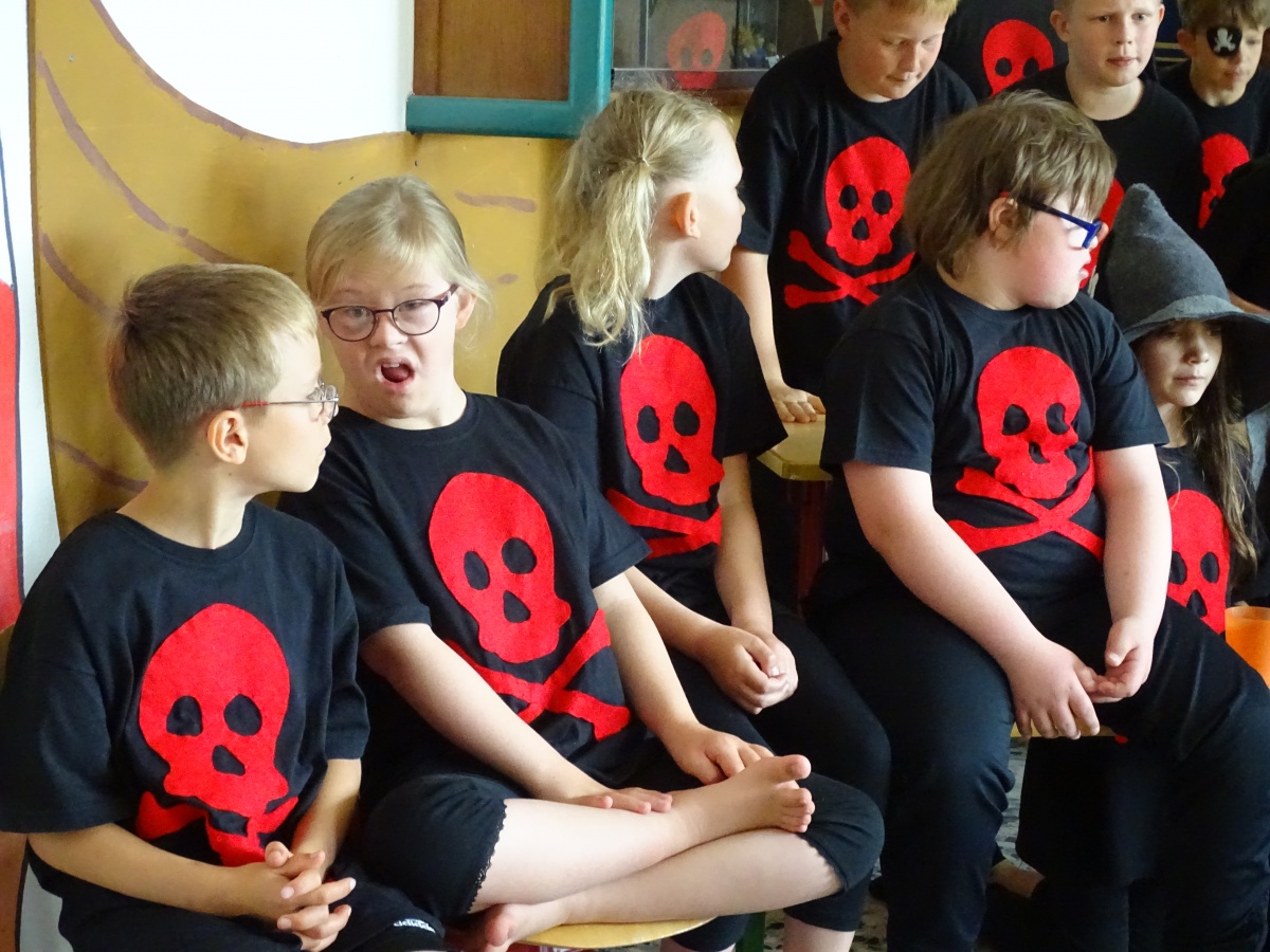 Frau Pohl freute sich sichtlich sehr, dass ihr Wunsch in Erfüllung gegangen war und dass alle Kinder - ob als Schauspielerin oder Schauspieler mit großer oder kleiner Rolle, ob als Sängerin oder Sänger - eine Rolle spielten und dass auch unsere Kinder der Helga-Leinung-Schule einbezogen werden konnten: Alle waren wichtige Zuschauerinnen und Zuschauer, einige konnten Lieder mitsingen und ein paar spielten sogar mit und hatten merklich viel Spaß daran, zu den wilden Piraten dazuzugehören und bei der Entführungsszene mitmachen zu können!