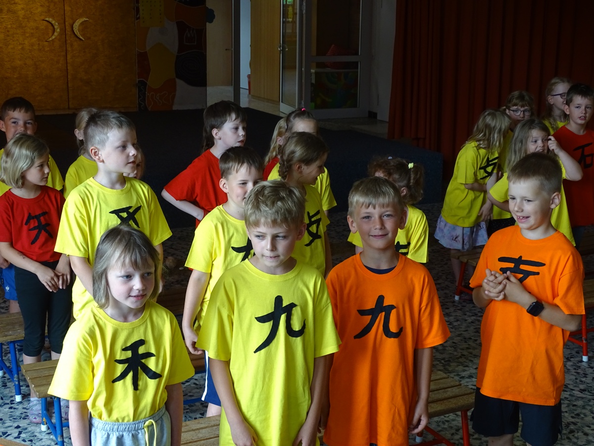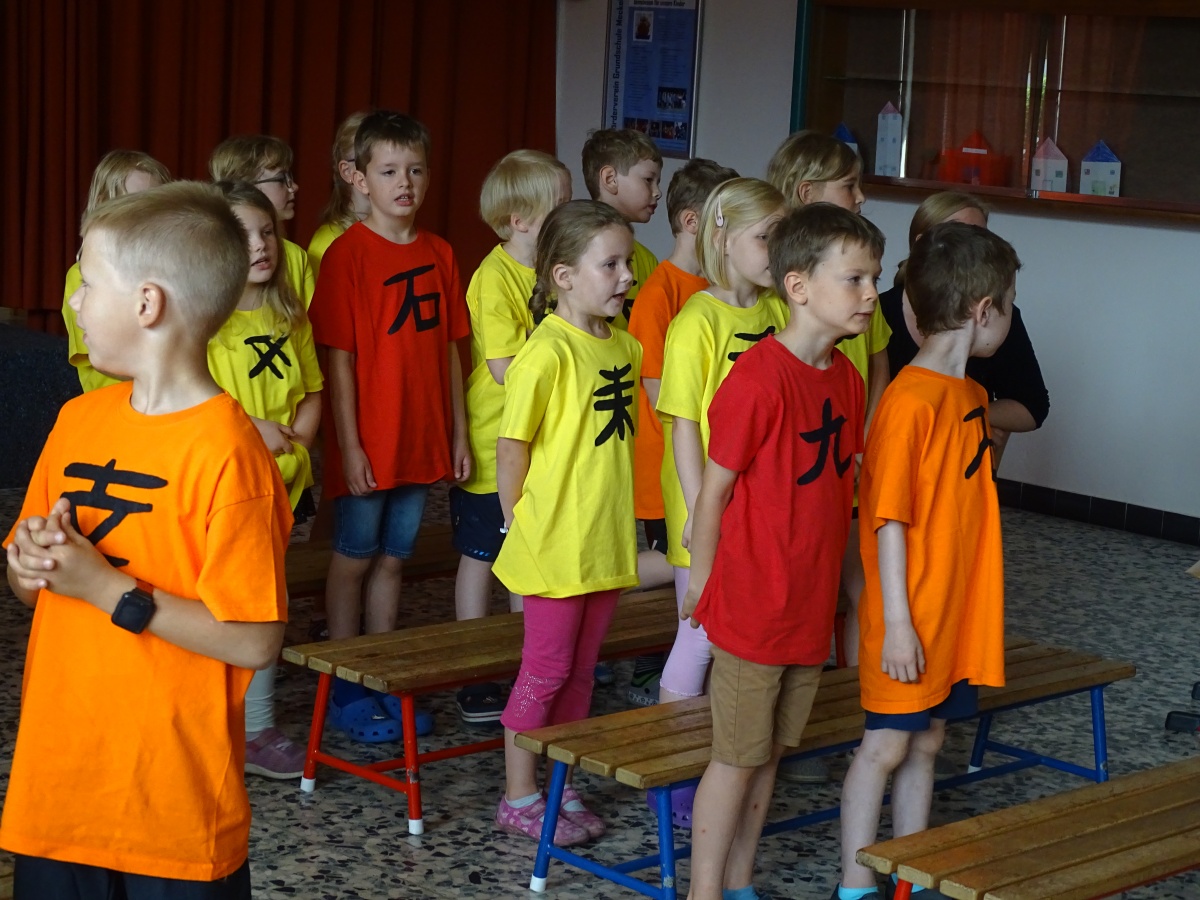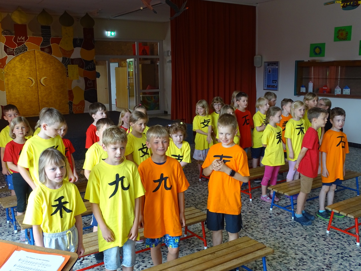 Und manche halfen ihr, für unsere 1. Klassen chinesische Zeichen auszuschneiden und auf gelbe, rote und orangefarbene Hemden zu nähen.