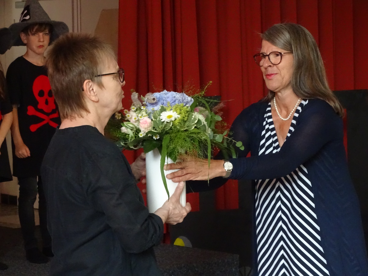 Sie bedankte sich bei allen Beteiligten - den Kindern, ihren Kolleginnen, allen Mitarbeiterinnen und Mitarbeitern und besonders bei Herrn Kaiser, der auch bei diesem Stück wieder jederzeit so tatkräftig geholfen hatte, und bei unseren beiden FSJlerinnen Lina Mohr und Fenna Liestmann. Die beiden hatten hinter dem Vorhang ''die Fäden in der Hand'' und damit dem Ganzen ein tolles Timing verpasst, das für eine schöne Aufführung so wichtig ist.