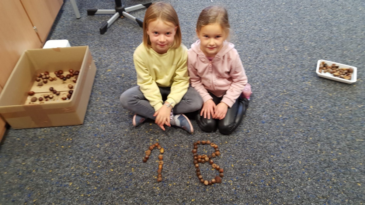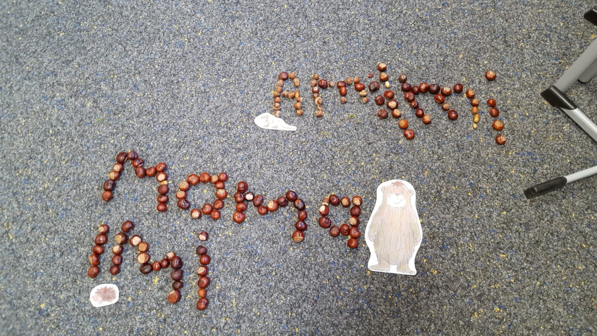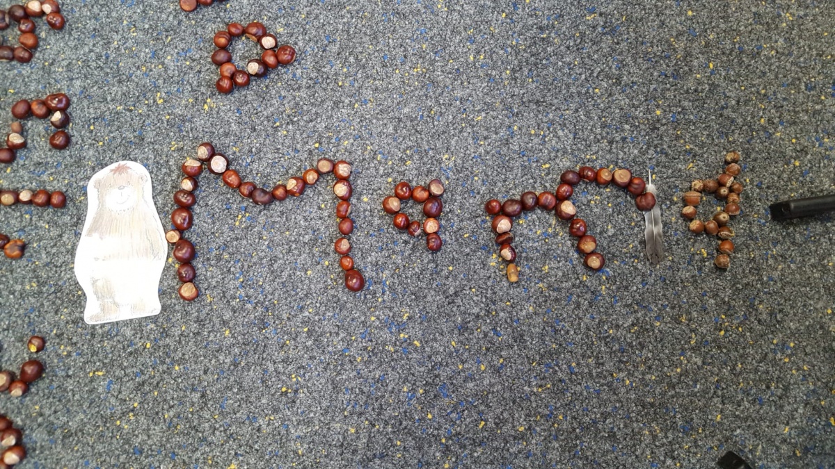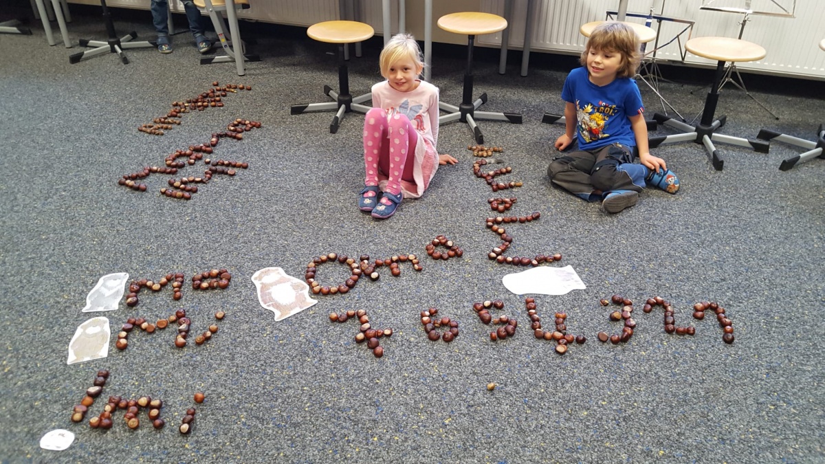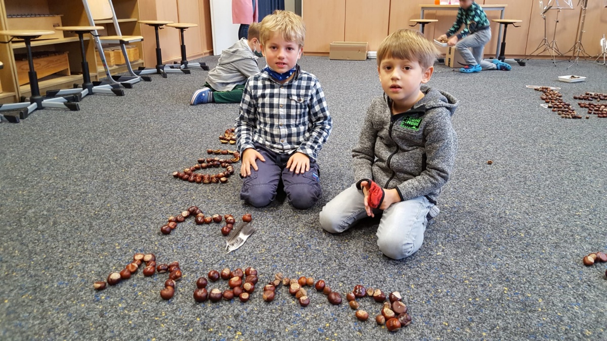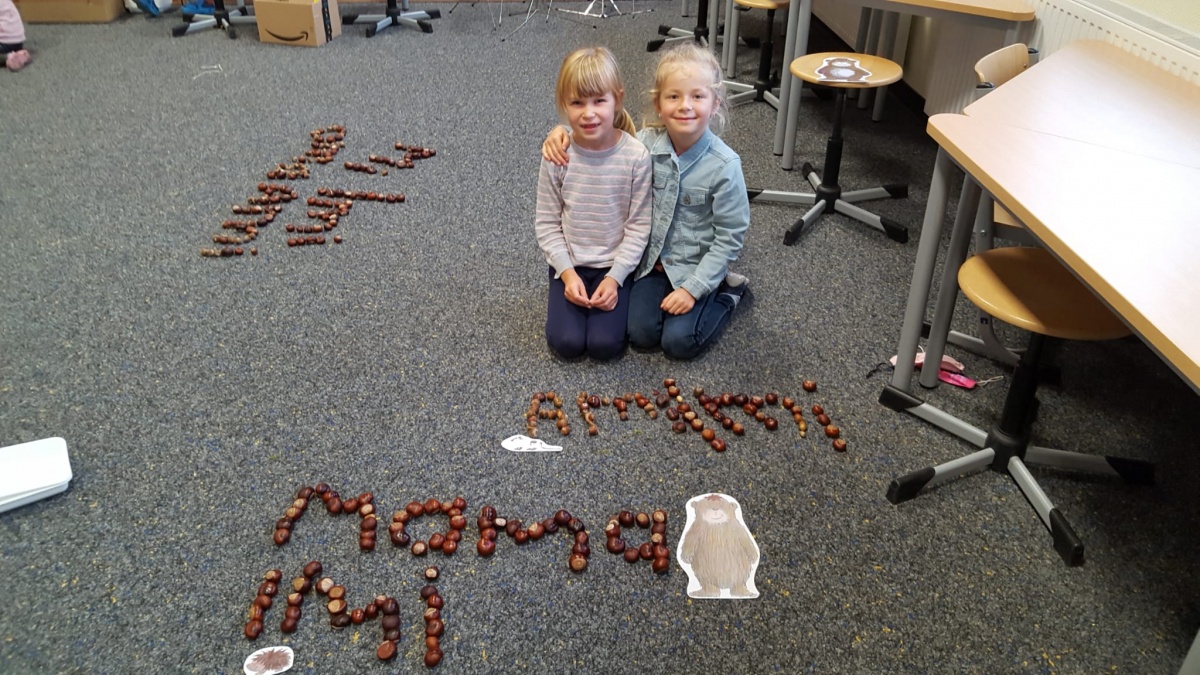 Am letzten Schultag vor den Herbstferien wurden nun aus den gesammelten Kastanien, Eicheln und anderen Fundstücken von allen mit viel Spaß und Eifer die bisher erlernten Wörter, Buchstaben und Zahlen gelegt.
