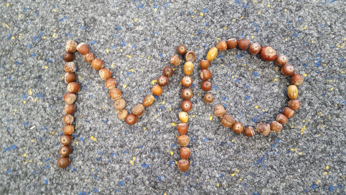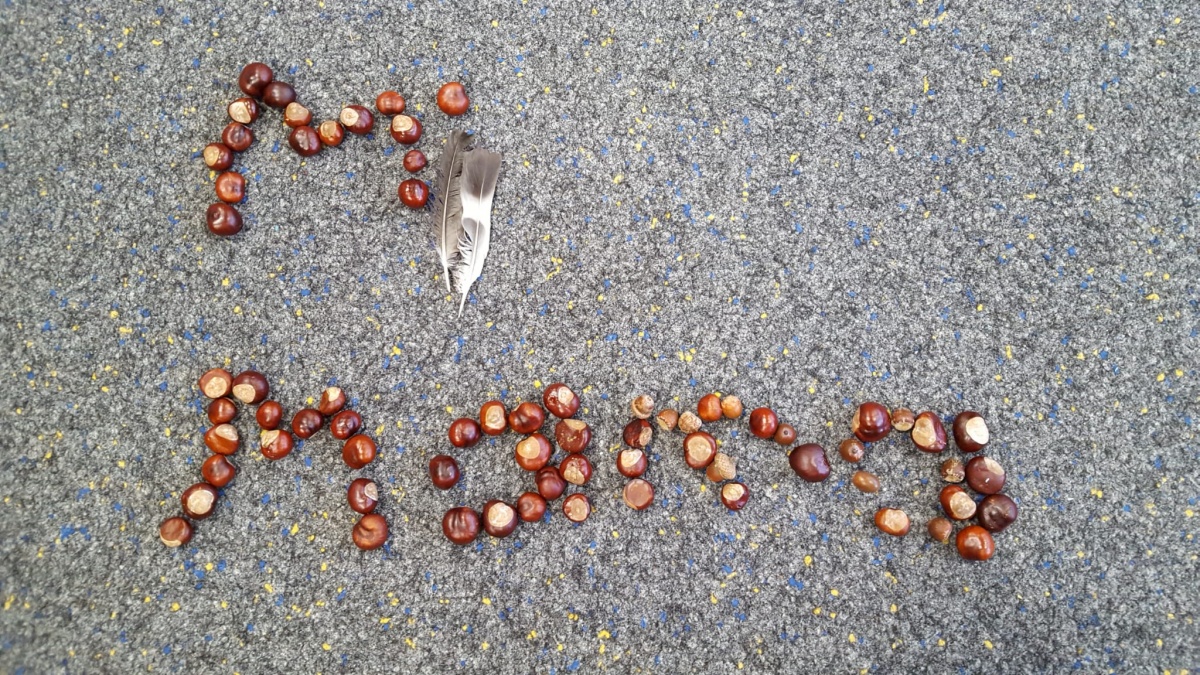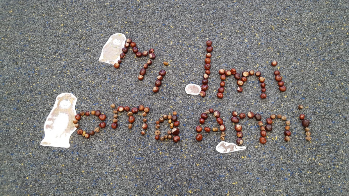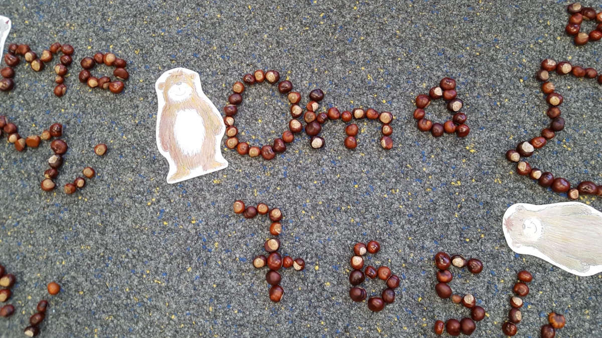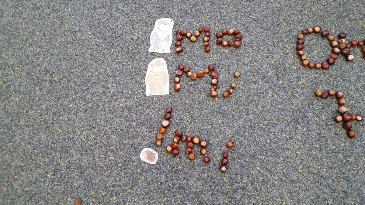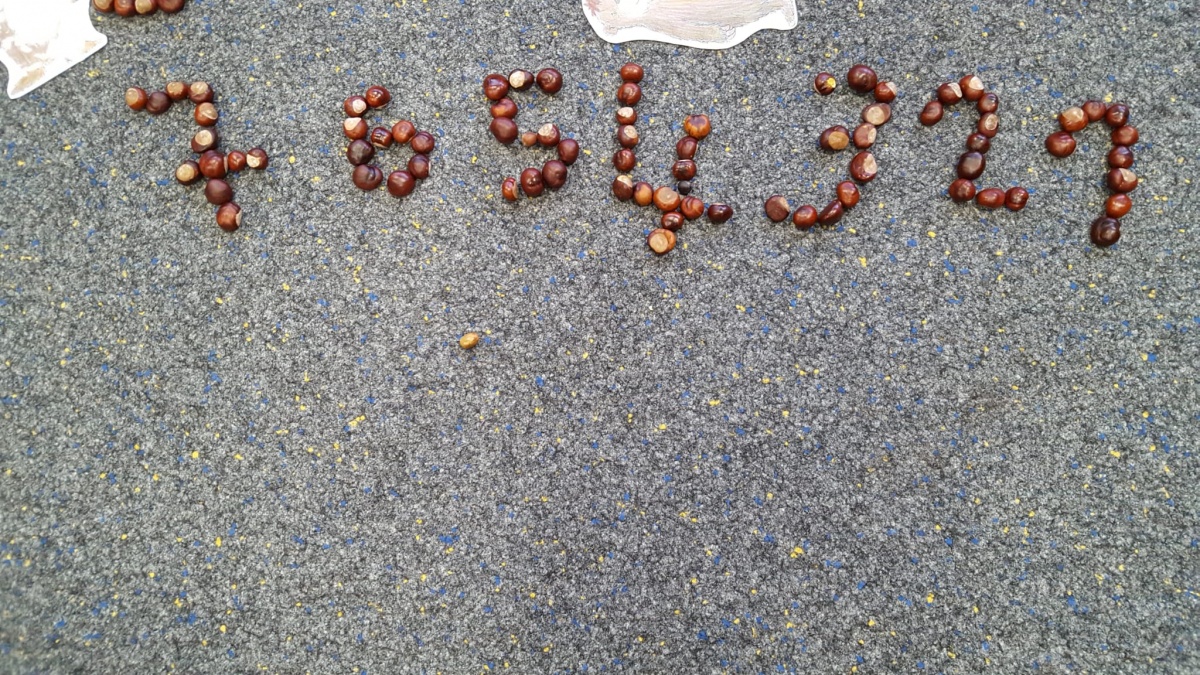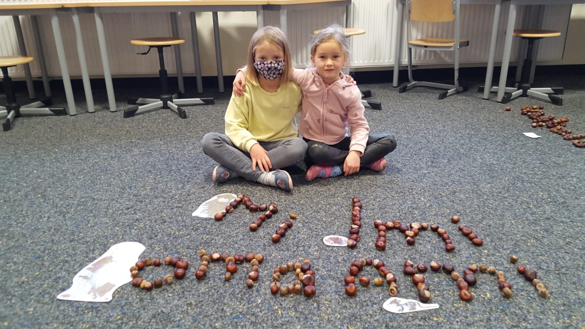 Am letzten Schultag vor den Herbstferien wurden nun aus den gesammelten Kastanien, Eicheln und anderen Fundstücken von allen mit viel Spaß und Eifer die bisher erlernten Wörter, Buchstaben und Zahlen gelegt.