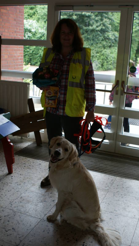 Christina stellte uns ihren einjährigen Golden Retrieverrüden Michel vor und brachte uns das so genannte Mantrailing näher. „Man“ steht hier für Mensch und „trail“ für verfolgen. Man nutzt den guten Geruchssinn der Hunde und setzt Gebrauchshunde als Personensuchhunde ein. Christina berichtete uns von spannenden „Fällen“, in denen Michels Hundekollegen der K-9-Hundestaffel halfen gesuchte Personen zu finden. Wir erfuhren, was ein Hund in der Mantrailing-Ausbildung lernt und wie viele Prüfungen er ablegen muss, um auch offiziell suchen zu dürfen. Außerdem lehrte uns Christina, welche Dufträger sich am besten zum „Abriechen“ eignen und wie ein Einsatz abläuft.