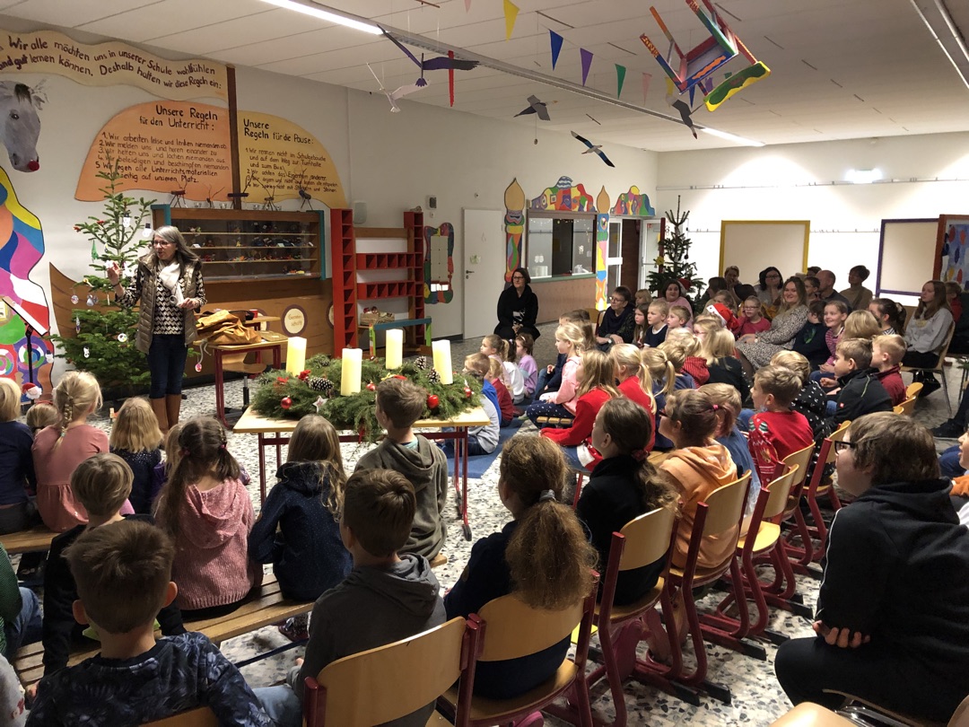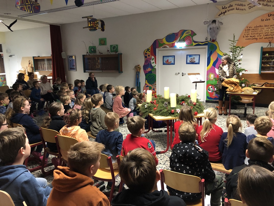 Frau Klieber las einen Brief vom Nikolaus vor. In diesem lobte er alle Kinder und Mitarbeiterinnen und Mitarbeiter an unserer Schule dafür, wie gut sie die letzten Jahre mit Corona bewältigt haben. Auch schrieb er, dass er sich über den Schmuck in der Halle sehr freute!
