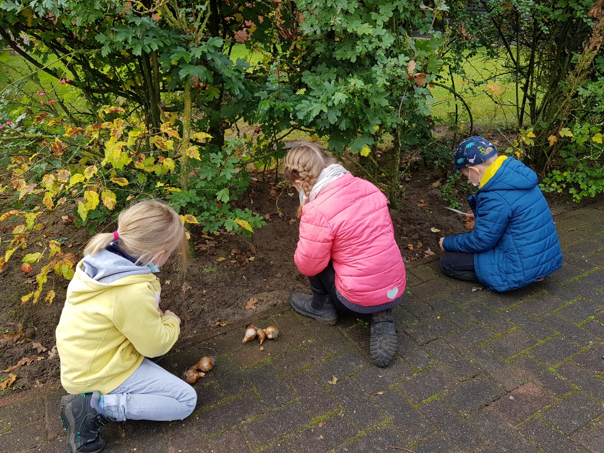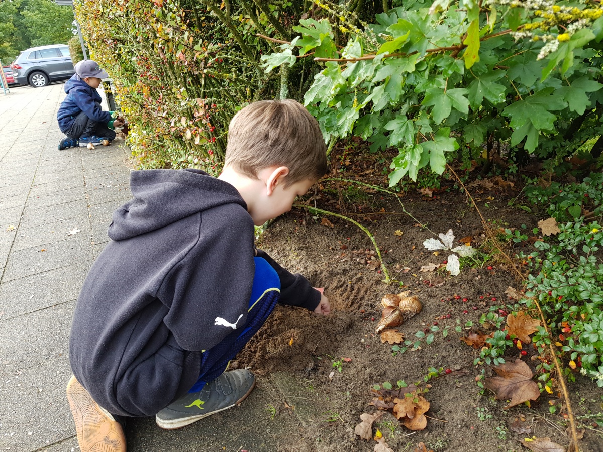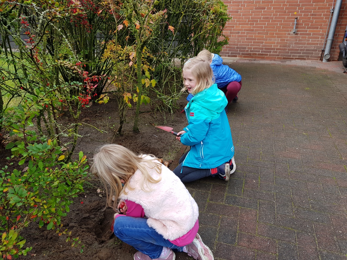 Die Kinder unserer 1. Klassen haben jetzt begonnen, hier ihre Osterglockenzwiebeln, die sie in ihren Schultüten fanden, zu setzen. Das war gar nicht so einfach, denn die Erde ist mit vielen Wurzeln der Hecken durchzogen. Aber das schreckte die Kinder nicht und sie buddelten möglichst tiefe Löcher, um ihren Zwiebeln einen guten Halt zu verschaffen.