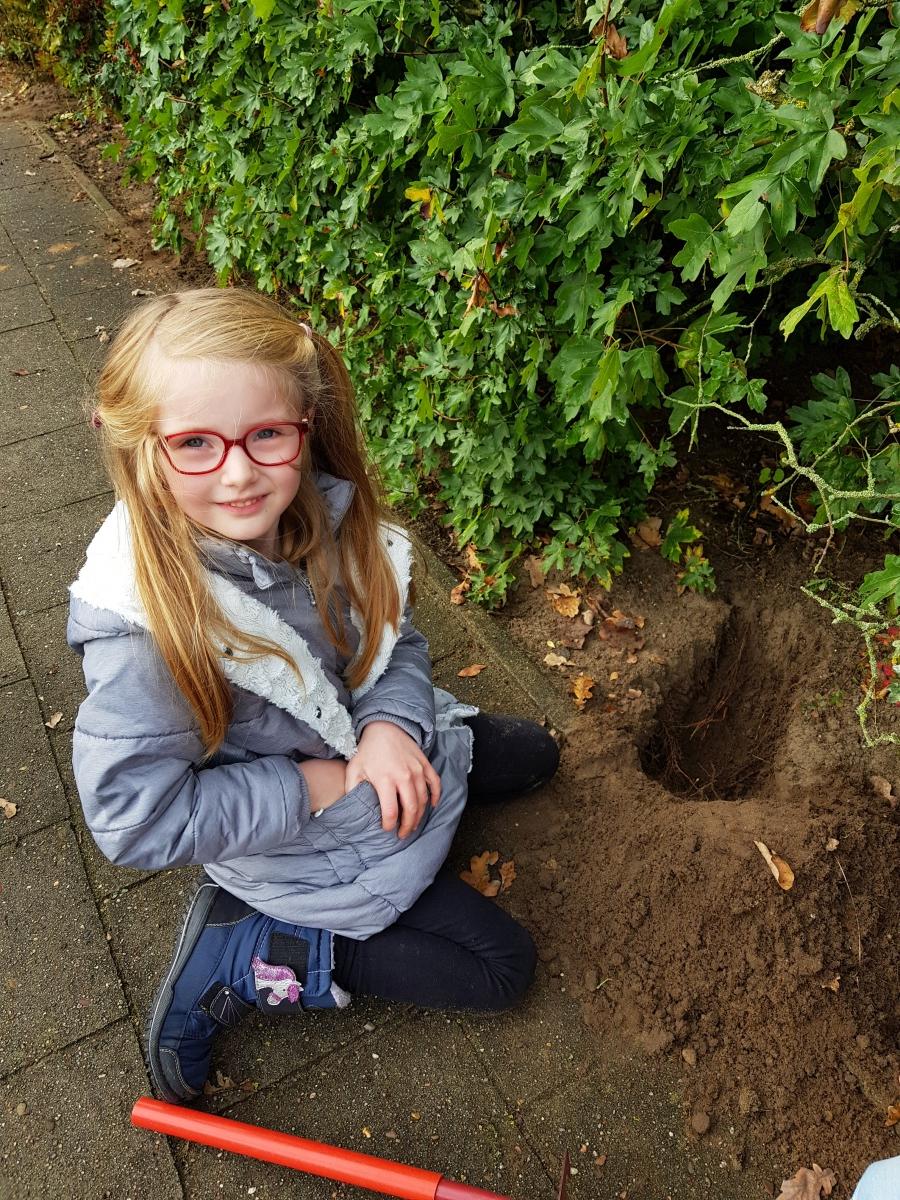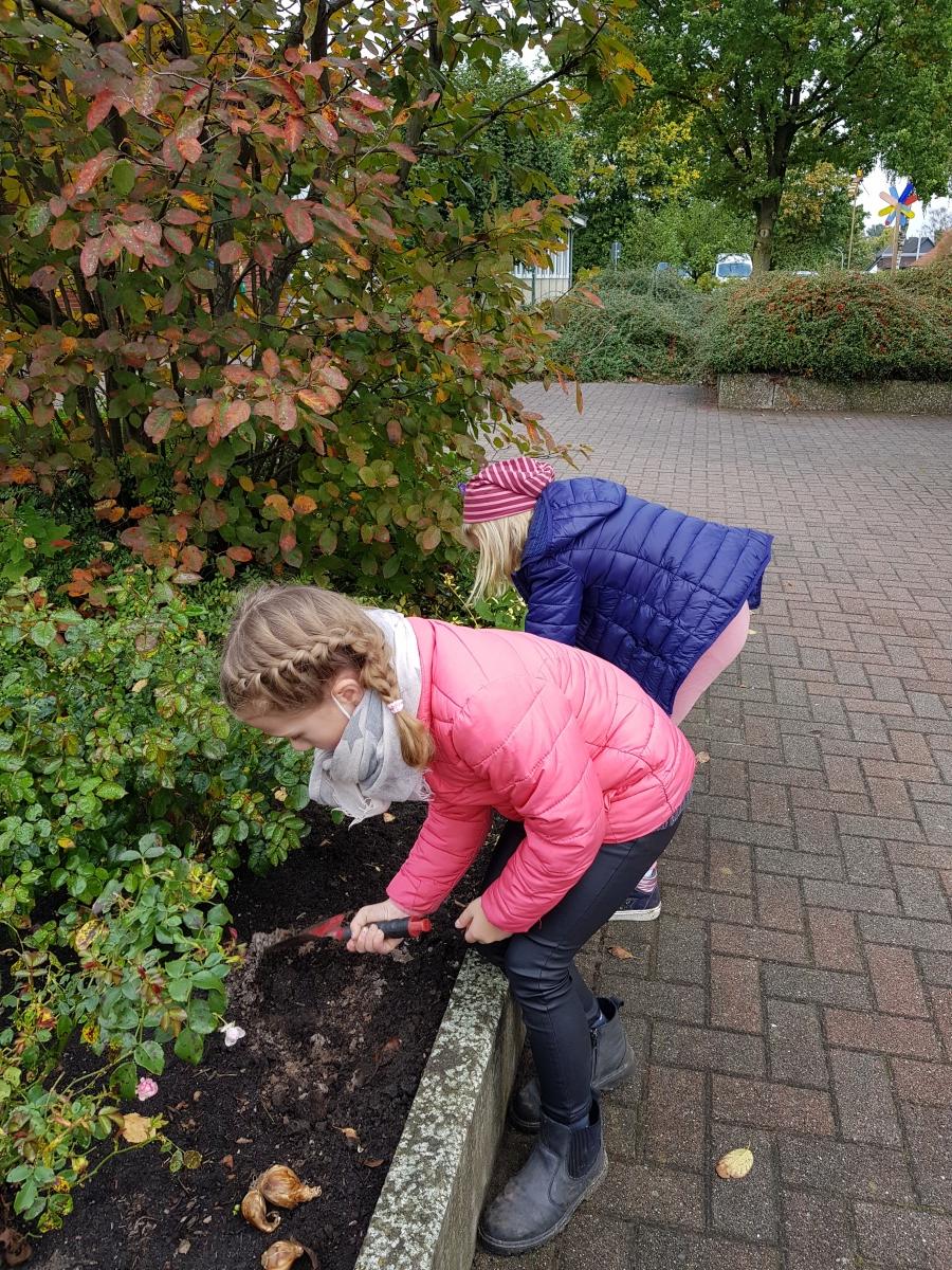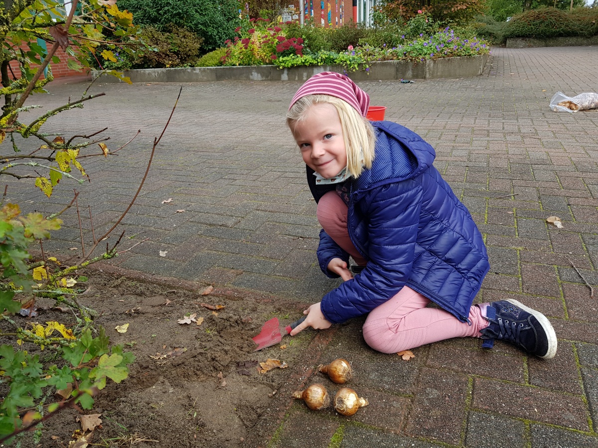 Die Kinder unserer 1. Klassen haben jetzt begonnen, hier ihre Osterglockenzwiebeln, die sie in ihren Schultüten fanden, zu setzen. Das war gar nicht so einfach, denn die Erde ist mit vielen Wurzeln der Hecken durchzogen. Aber das schreckte die Kinder nicht und sie buddelten möglichst tiefe Löcher, um ihren Zwiebeln einen guten Halt zu verschaffen.