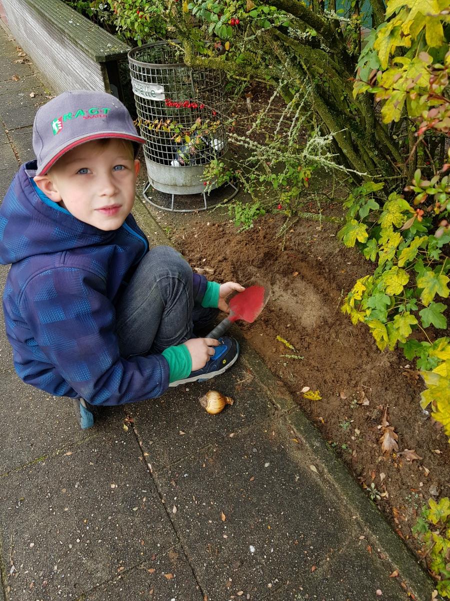 Am Ende hatte die Klasse 1a weit über 100 Zwiebeln gesetzt, hatten dabei so manchen Regenwurm entdeckt und bestaunt und hoffen jetzt, dass niemand auf die bald aus der Erde wachsenden Pflänzchen tritt und dass ihre Osterglocken im Frühjahr Mitschülerinnen und Mitschüler, alle Lehrerinnen und Mitarbeiter und vielleicht sogar das ganze Dorf erfreuen.