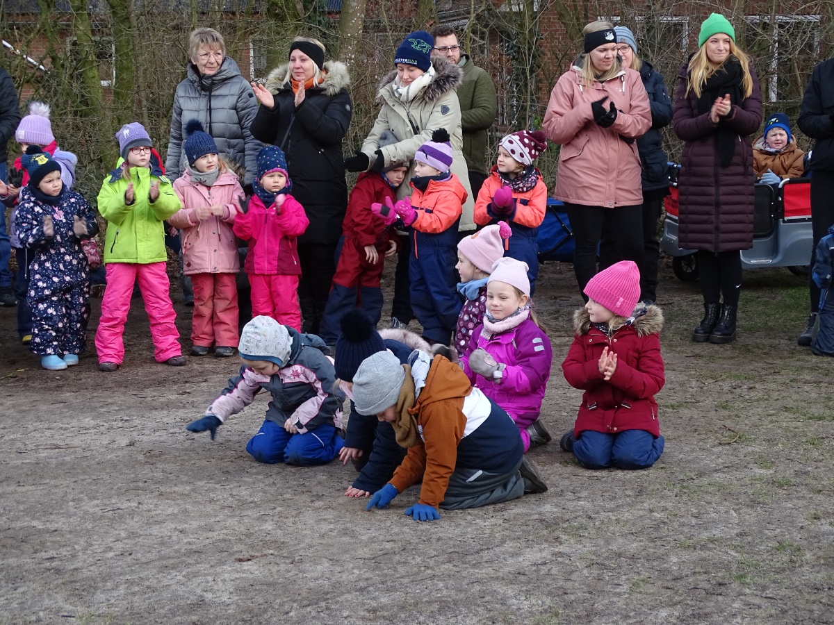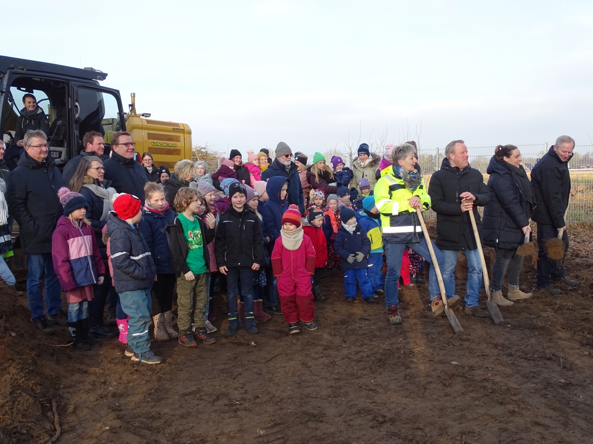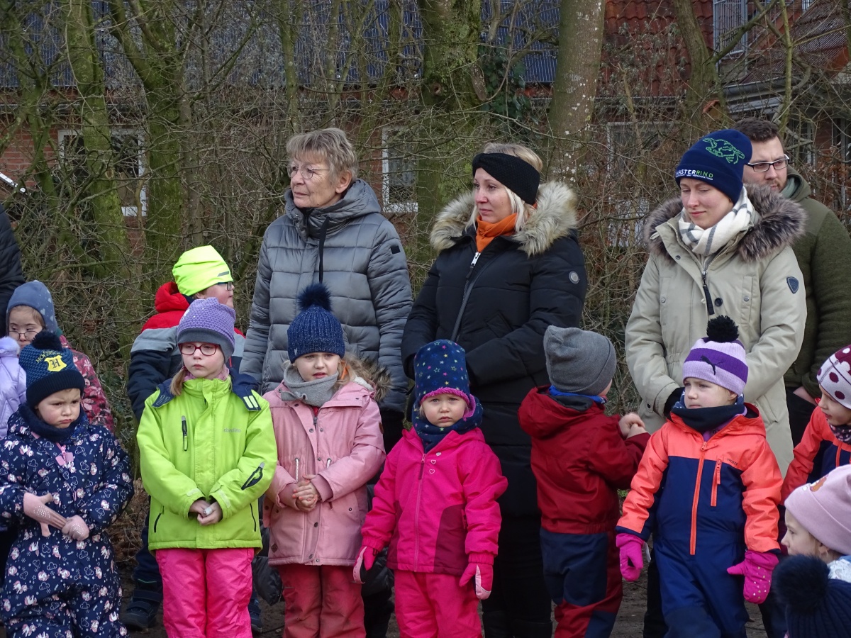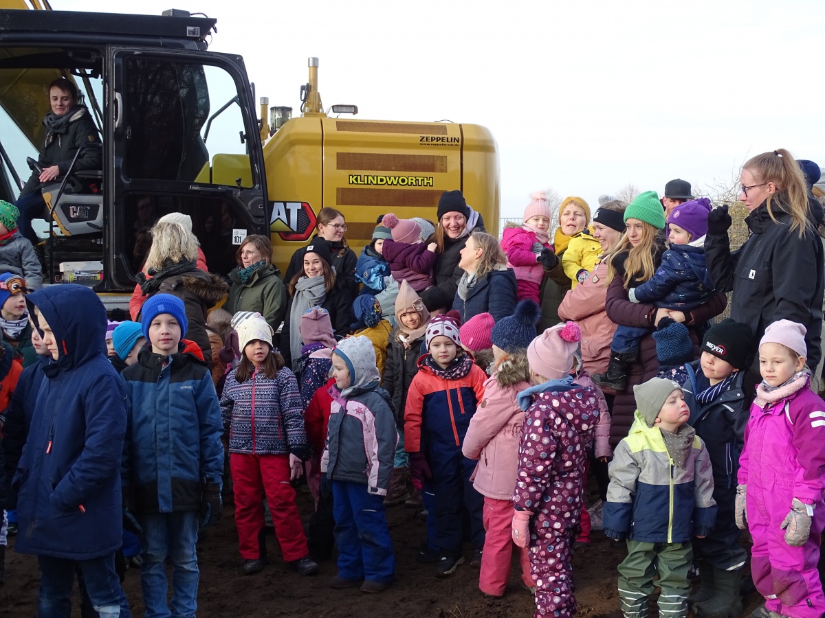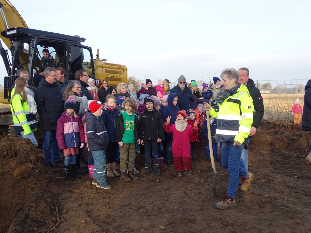 Heute, am 20.1.2023 um 10 Uhr, kam dann viel Besuch: Bei Eiseskälte, aber strahlendem Sonnenschein versammelten sich viele kleine und große Kindergartenkinder mit ihren Eltern, mit Erzieherinnen und Erziehern und der Leiterin Dagmara Stahmer. Der Samtgemeindebürgermeister Jörn Keller war gekommen, die Bauamtsleiterin Katharina Freimuth, die Eigentümer der zu bebauenden Flächen Helga und Günter Tiemann, die Architektin Dorothea Hirschfeld-Albers, der Bürgermeister von Klein Meckelsen Hermann Meyer, der Geschäftsführer der Lebenshilfe Volker Wahlers mit manchen seiner ''alten'' und neuen Mitarbeiterinnen und Mitarbeitern des hiesigen Standortes, Anne Klieber, unsere Schulleiterin, und Detlef Kaiser, unser Hausmeister.