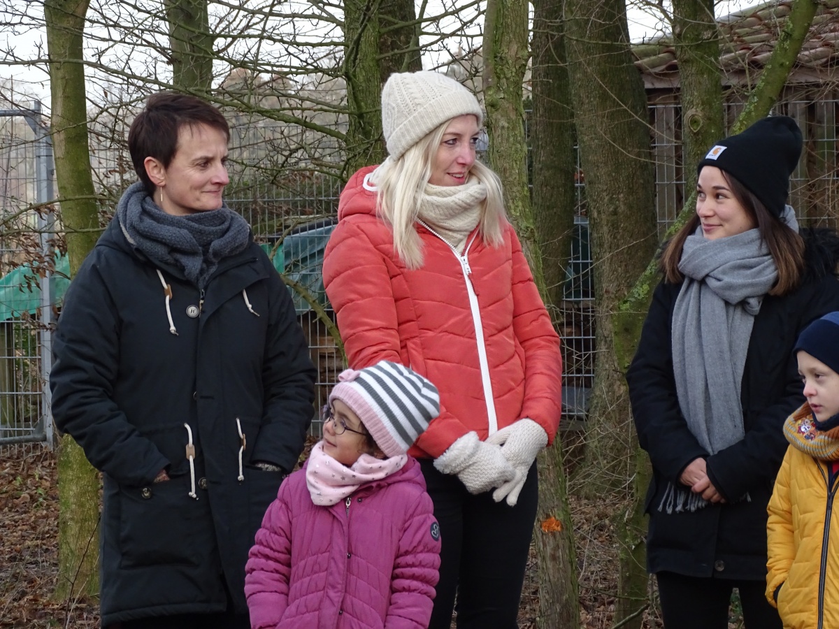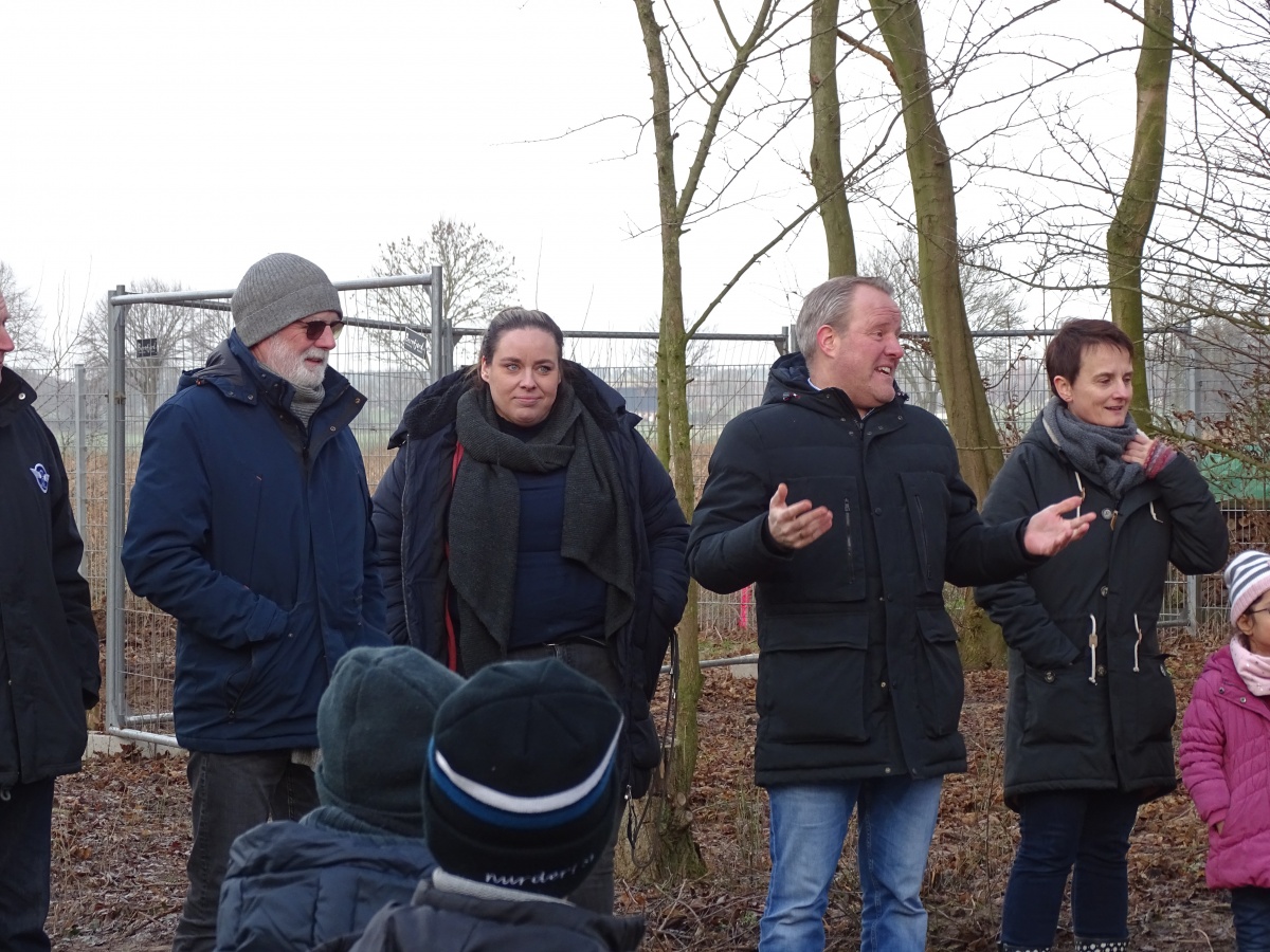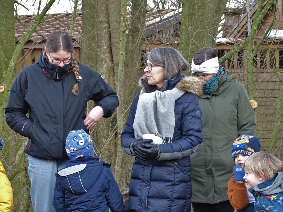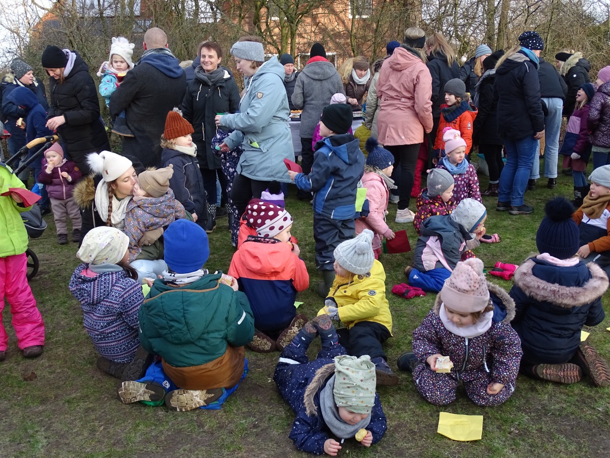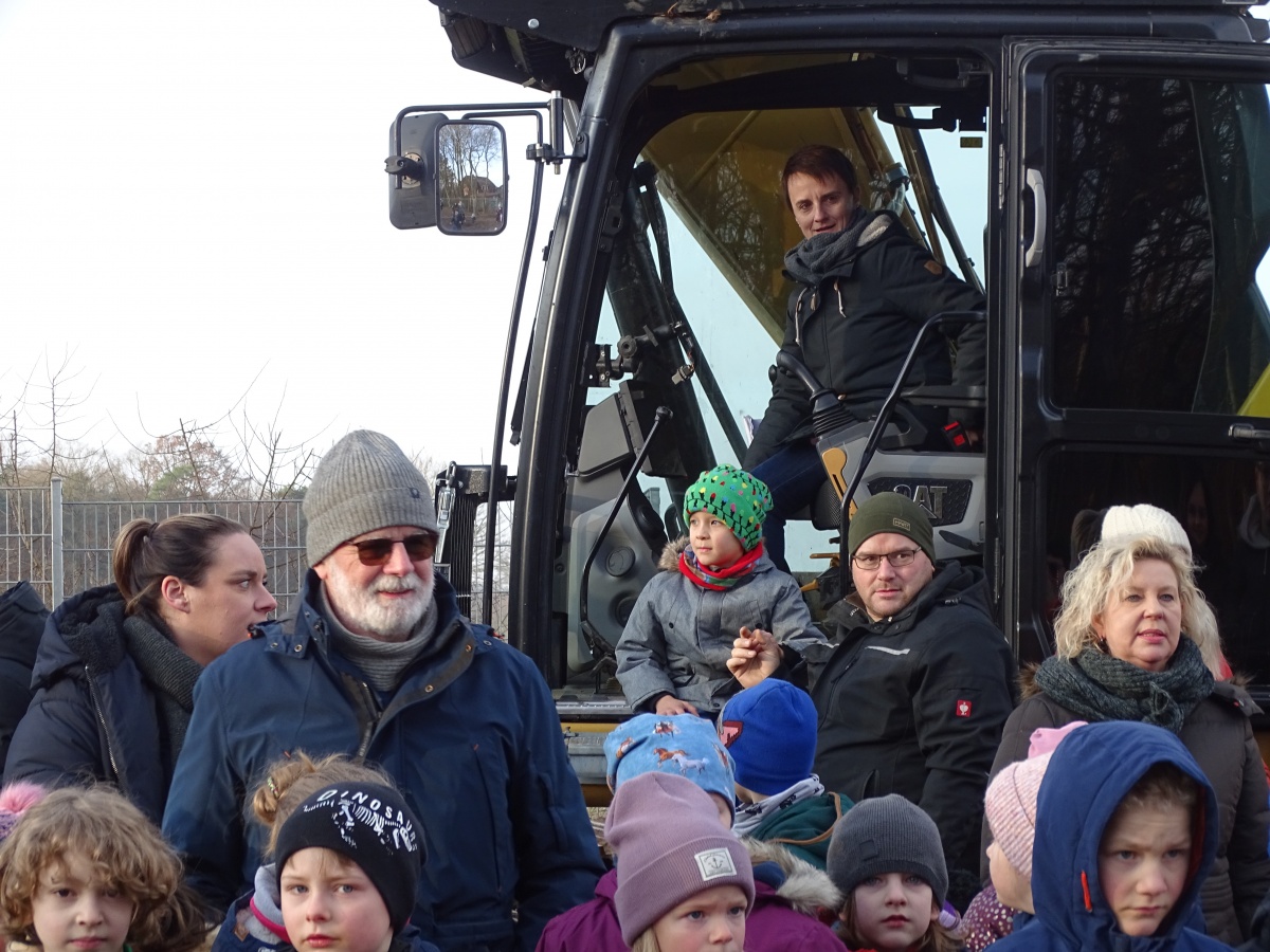 Heute, am 20.1.2023 um 10 Uhr, kam dann viel Besuch: Bei Eiseskälte, aber strahlendem Sonnenschein versammelten sich viele kleine und große Kindergartenkinder mit ihren Eltern, mit Erzieherinnen und Erziehern und der Leiterin Dagmara Stahmer. Der Samtgemeindebürgermeister Jörn Keller war gekommen, die Bauamtsleiterin Katharina Freimuth, die Eigentümer der zu bebauenden Flächen Helga und Günter Tiemann, die Architektin Dorothea Hirschfeld-Albers, der Bürgermeister von Klein Meckelsen Hermann Meyer, der Geschäftsführer der Lebenshilfe Volker Wahlers mit manchen seiner ''alten'' und neuen Mitarbeiterinnen und Mitarbeitern des hiesigen Standortes, Anne Klieber, unsere Schulleiterin, und Detlef Kaiser, unser Hausmeister.
