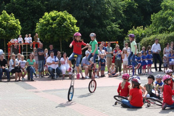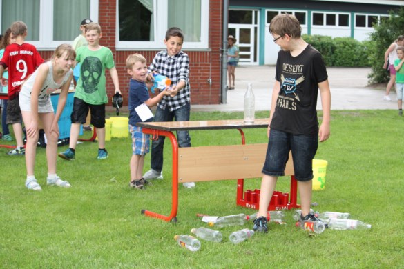 Die Einrad-AG bot eine wunderbare Aufführung zum Titel „Wir werden immer größer“, der sowohl zu allen Kindern, wie auch zum Werdegang der Grundschule passte. Die schönen Formationen und Figuren, aber auch die mutigen Kinder auf den Hocheinrädern ließen die ZuschauerInnen staunen. Dann endlich startete das Sommerfest. Bei Sonne und sommerlichen Temperaturen vergnügten sich die Kinder an den verschiedenen Spielestationen, die von den einzelnen Klassen vorbereitet und betreut wurden. Actionreich ging es beim Wasserbomben-Volleyball, Sackhüpfen und Dreibein-Eierlauf zu, wer es etwas ruhiger angehen lassen wollte, der knüpfte Freundschaftsbänder oder häkelte mit der Astgabel.