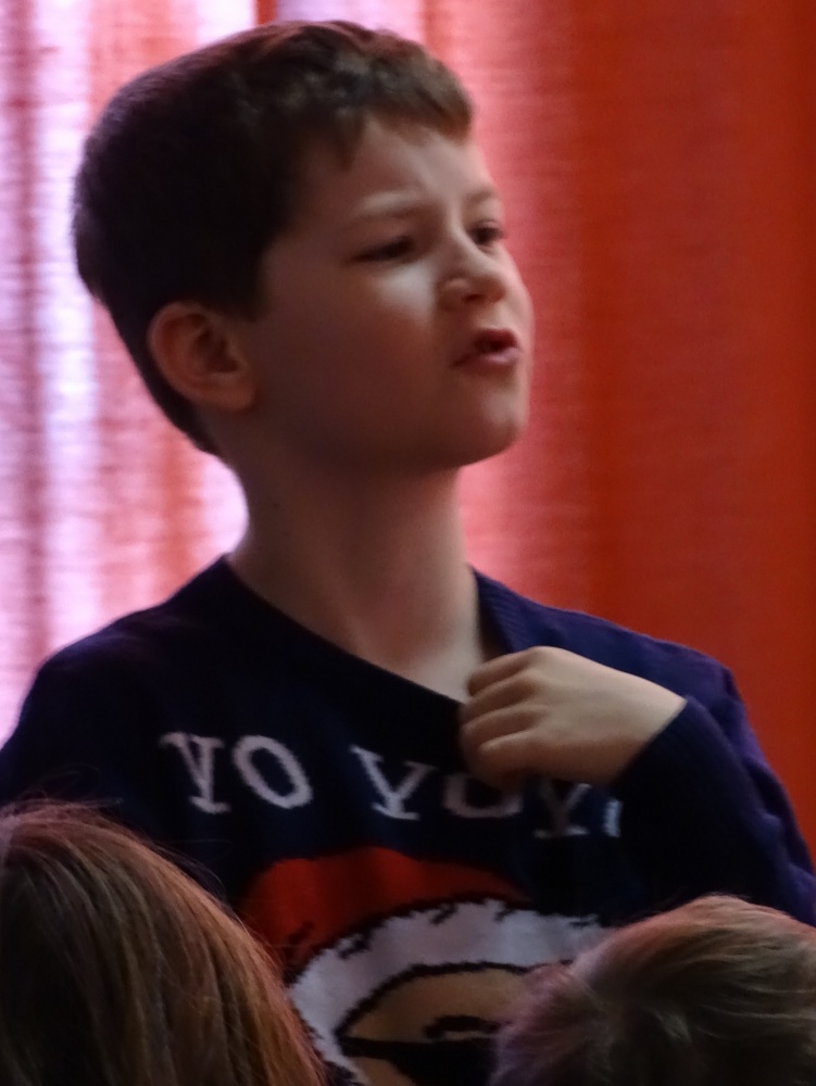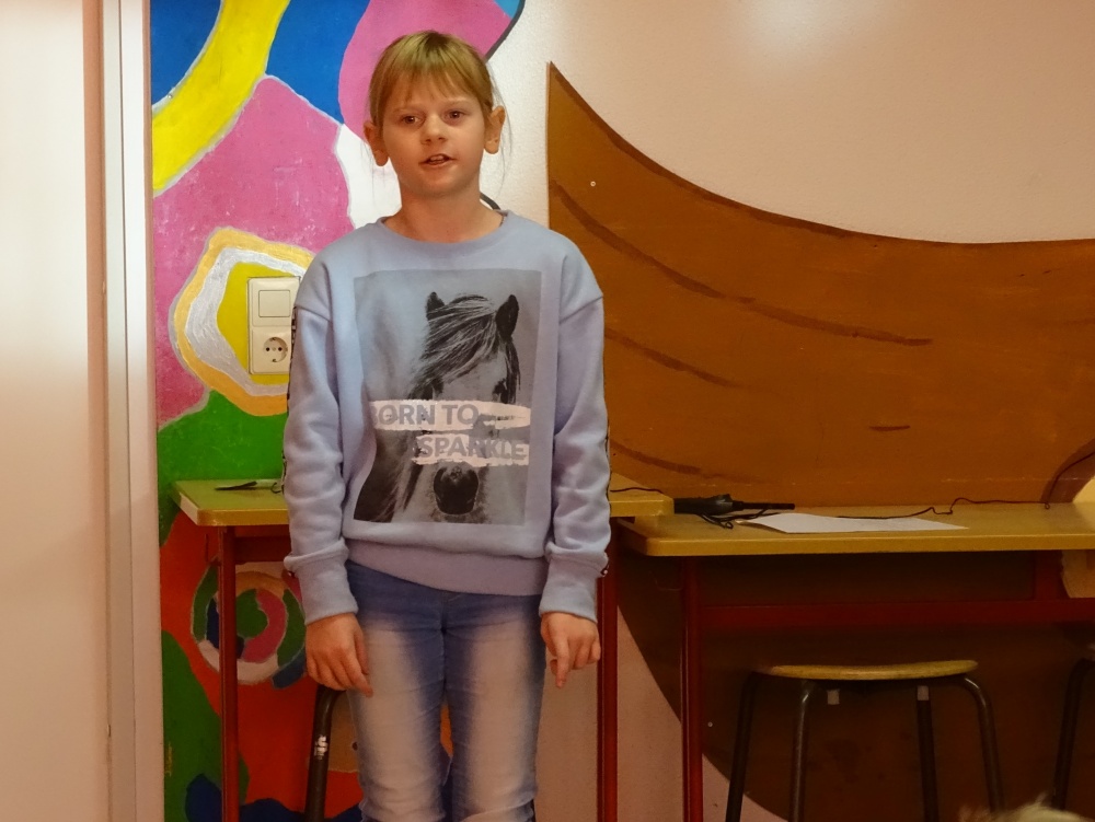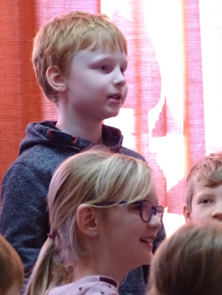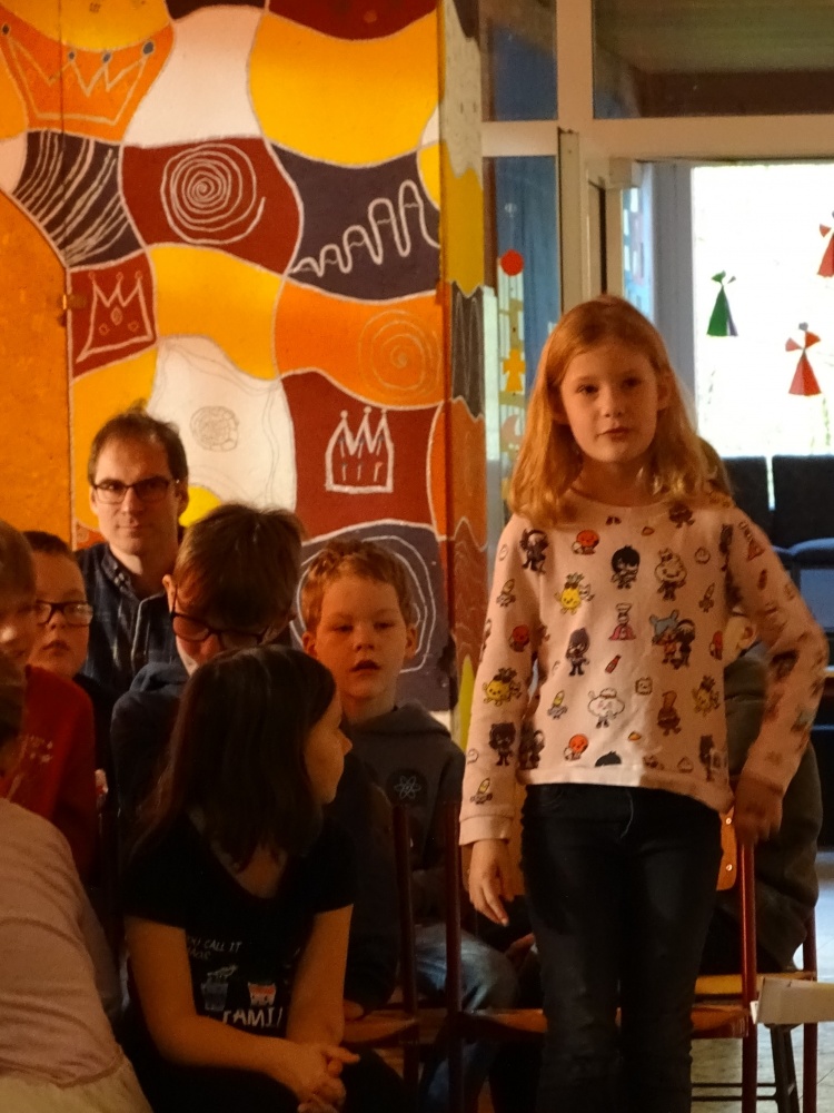 Einen Solo-Auftritt hatte Josie aus unserer Klasse 4 mit dem langen Gedicht 'Knecht Ruprecht'. Mit fester Stimme, starkem Ausdruck und gelassenem, aber hochkonzentrierten Auftreten brachte sie ganz allein vor großem Publikum dieses lange Gedicht von Theodor Storm zu Gehör.