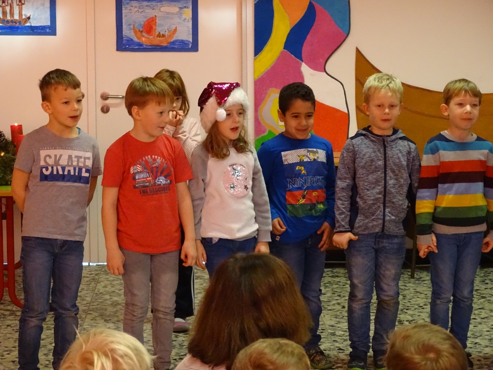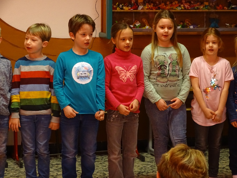 Mit erstaunlich lauter, sicherer Stimme und deutlicher Aussprache ihrer Verse überraschten die Kinder aus der Klasse 2b mit dem Gedicht von der 'Weihnachtsmaus' - einem merkwürdigen Tier, das offensichtlich nur zu Weihnachten aus seinem Loch herauskommt und verantwortlich für das Verschwinden etlicher Leckereien zu sein scheint.