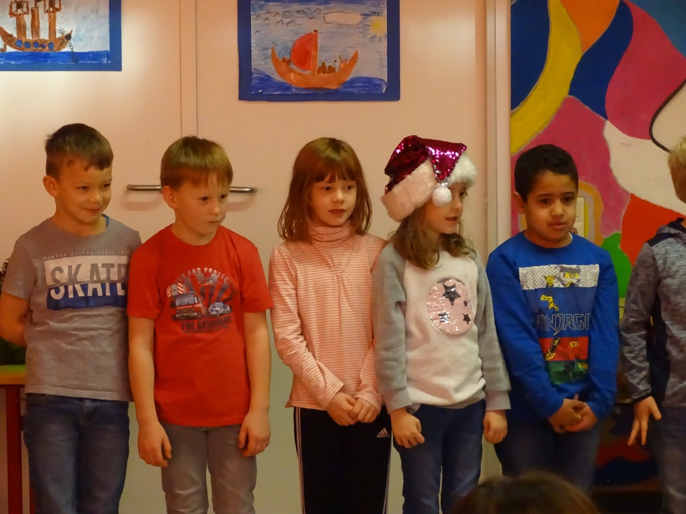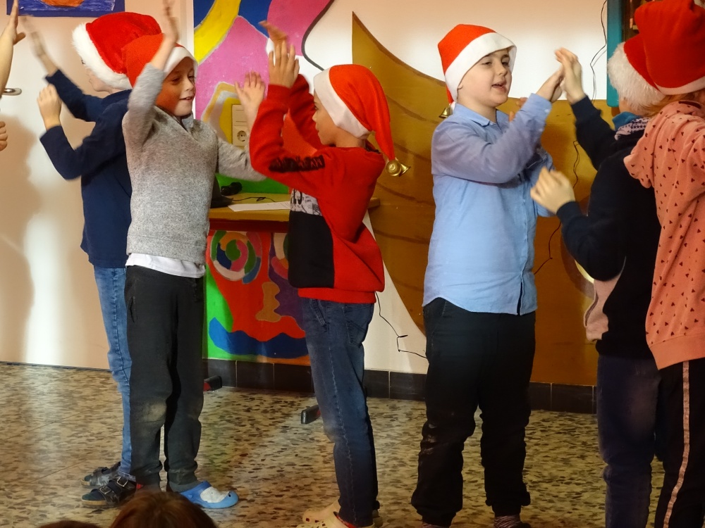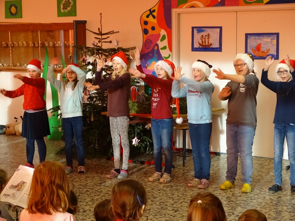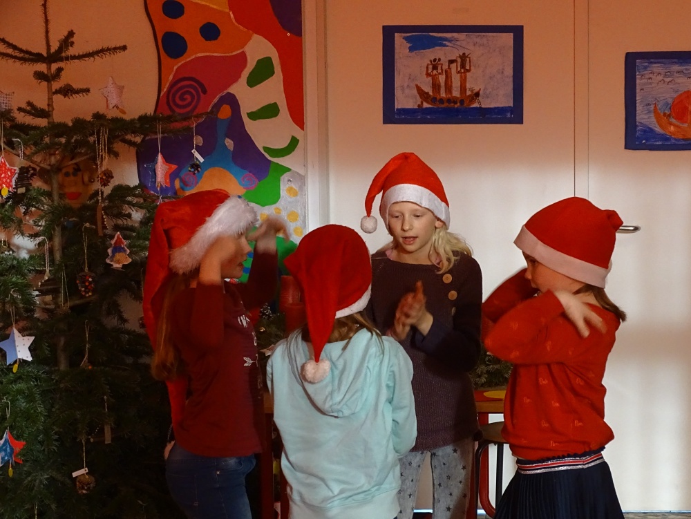 Weil die Kinder der Klasse 3a vor lauter Aufregung vor Weihnachten schon ganz zappelig sind, hatten sie ihr Bewegungsbedürfnis in eine Vorführung mit bodypercussion umgewandelt. Zu den Strophen von 'Bald nun ist Weihnachtszeit' klatschten sie allein oder mit Partnern oder sogar zu viert und ließen dabei ihre roten Mützen im Takt auf und ab wippen.