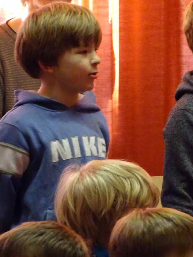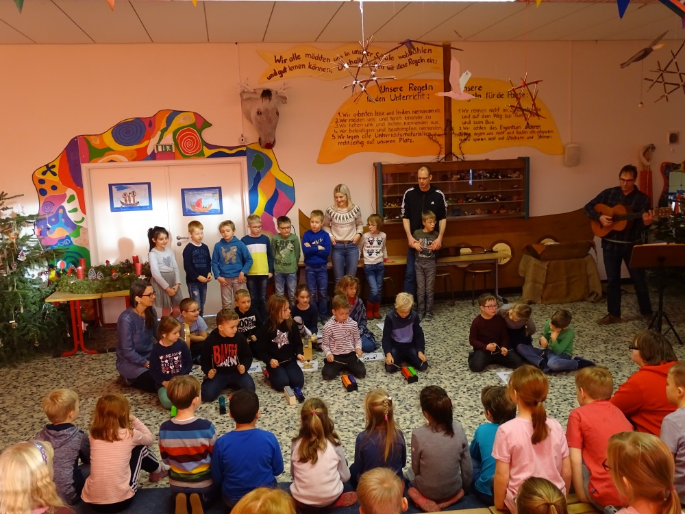 Zu einem besonders schönen Weihnachtssingen trafen wir uns am vorletzten Tag vor den Weihnachtsferien. Schon Wochen im Voraus hatten sich Kinder und Lehrerinnen überlegt, ob sie ein Gedicht, ein Musikstück oder ein Theaterstück einüben und darbieten wollten. Oft war deshalb die Pausenhalle für Proben besetzt und vielfach schallten Sprech- oder Gesangsproben aus den Klassenräumen.