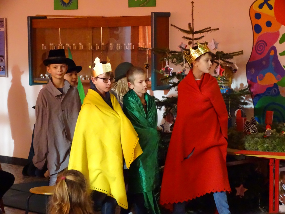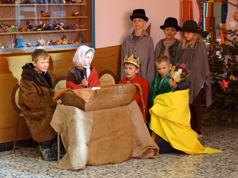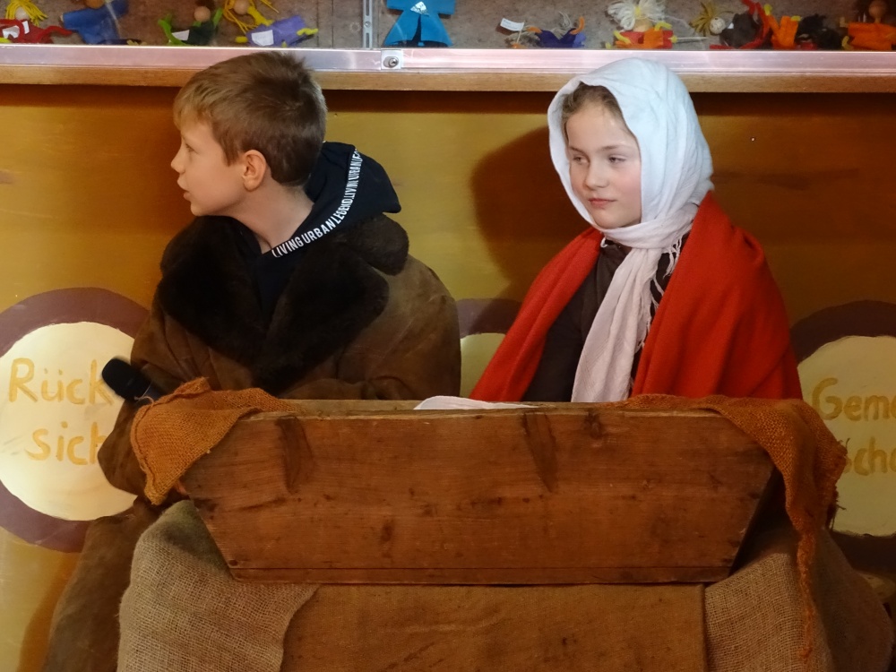 Mit ihrem Krippenspiel konnten die Kinder aus unserer 4. Klasse am Ende unseres Treffen noch einmal die volle Aufmerksamkeit aller Zuschauerinnen und Zuschauer auf sich ziehen. Unsere Großen spielten die Weihnachtsgeschichte - die Geschichte von Maria und Josef, die nach Bethlehem kamen, wo niemand diesen Fremden Einlass gewähren wollte. So landeten sie schließlich in einem Stall und legten ihr Neugeborenes in eine Krippe. Die Hirten der auf den umliegenden Feldern grasenden Schafe kamen staunend herbei und auch die drei Weisen aus dem Morgenland fanden den Weg hierher und beschenkten das Kind.