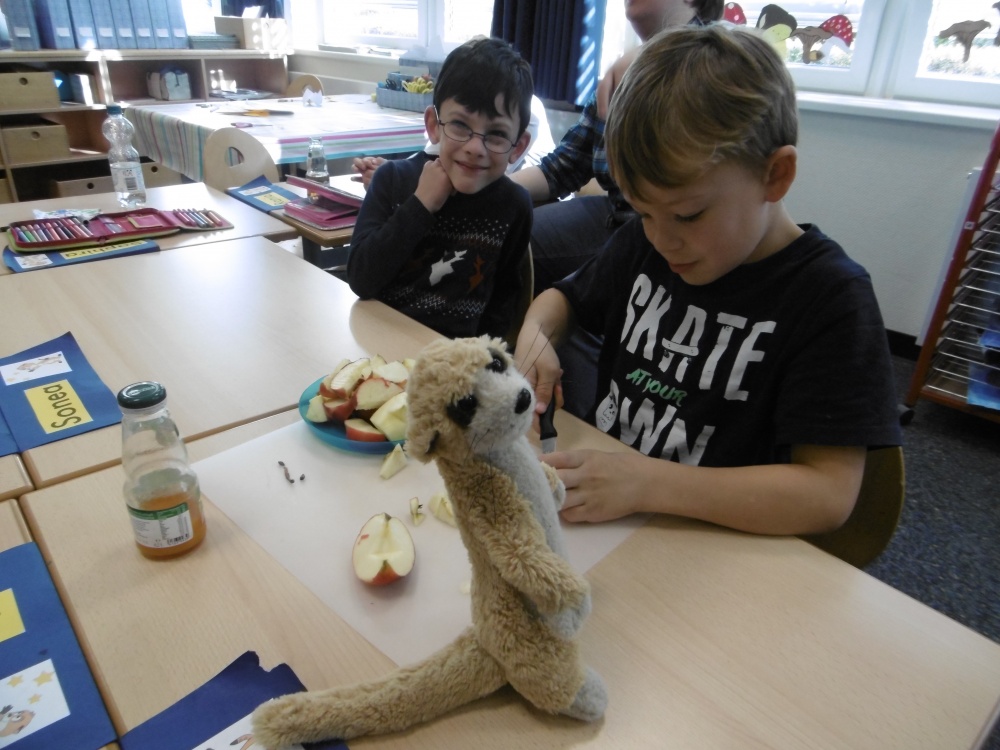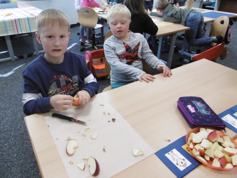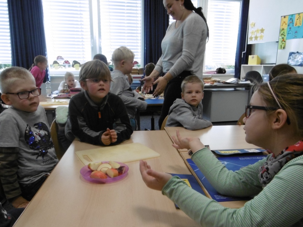 Die Schülerinnen und Schüler haben gemeinsam zum Thema ,,Apfel‘‘ geforscht: Wie sieht ein Apfel von innen aus? Wann und wo wachsen Äpfel? Wie schmecken verschiedene Apfelsorten?